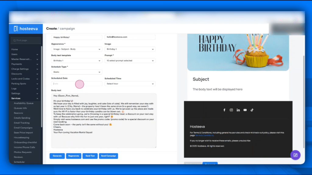 For example, send a "Happy Birthday, Enjoy 10% Off!" email to guests celebrating in September. With the help of Hosteeva AI, you can craft and personalize messages, adjusting subject lines, visuals, and tone all in minutes.