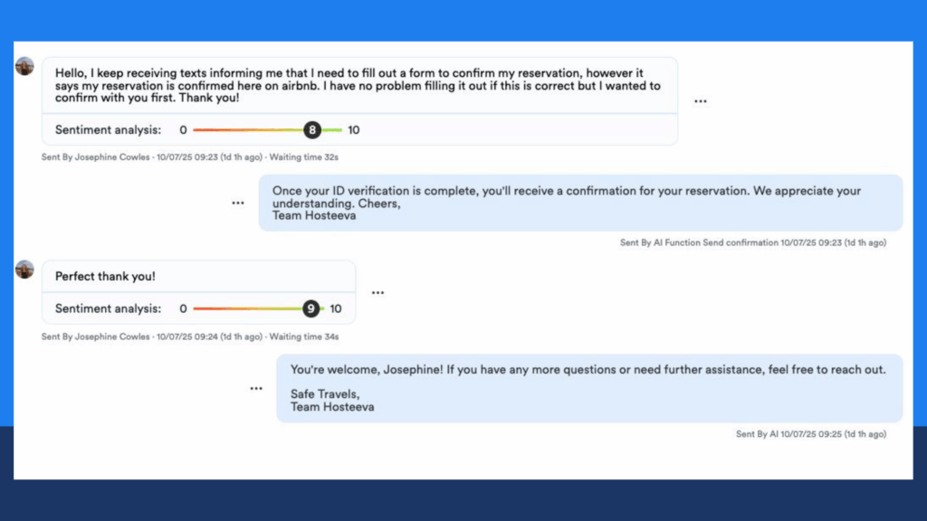 Every message, no matter where it starts , lands in a single, easy-to-use dashboard. Both you and Hosteeva's AI assistant can respond instantly.The AI handles common questions with warm, natural replies, while you focus on messages taht need a personal touch.