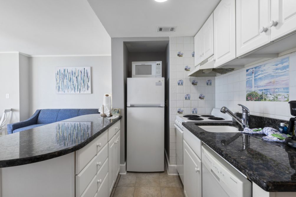 Designed for both comfort and convenience, this Meridian Plaza condo features a well-equipped kitchen, perfect for preparing meals while enjoying the view.