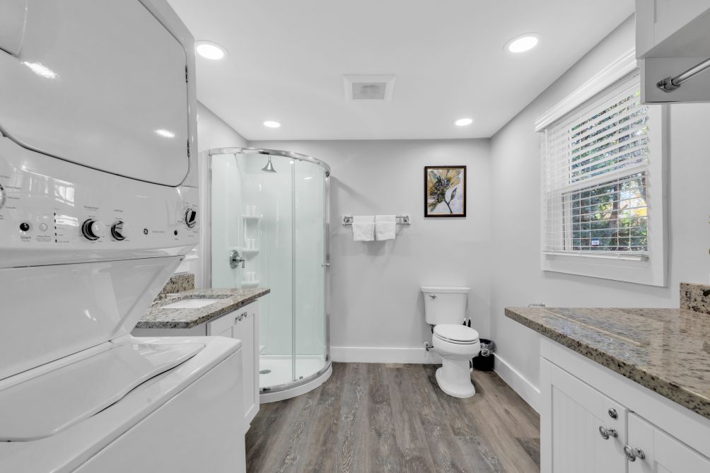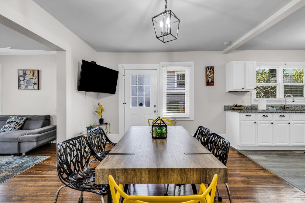 The cozy house features custom-made furniture and attention to details you’d expect from a luxury vacation home rental. The beautiful modern living room comes with a spacious and comfortable sofa and an accent armchair that is guaranteed to brighten up even the dullest of the mood. As you head into the dining and kitchen area, you’ll have plenty of room to gather around a beautiful modern wood table for a home-cooked meal or a local takeout.