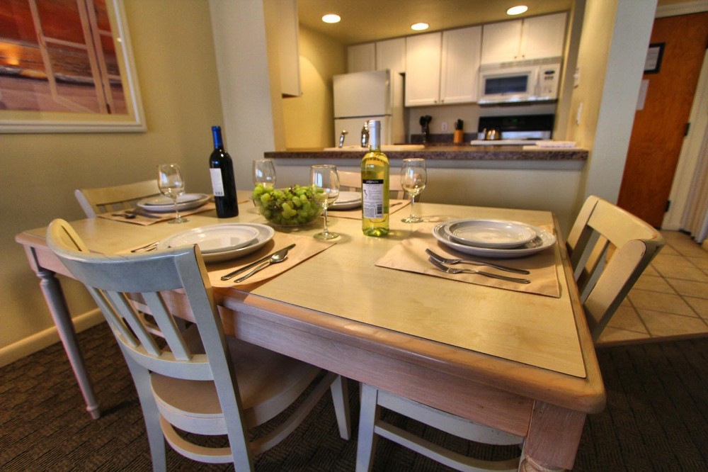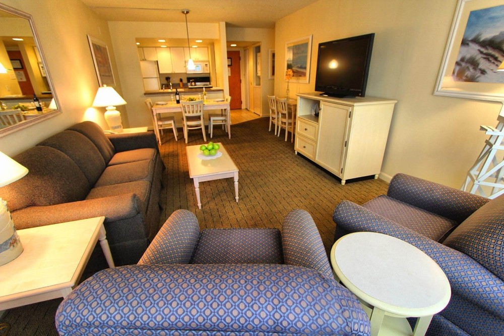 The one-bedroom suites feature a king-size bed in the bedroom. The unit includes a full kitchen, a queen sleeper sofa, and one bathroom with a whirlpool tub. The suite is equipped with A/C and a washer & dryer and most units come with a balcony. This room has a maximum occupancy of 4 and sleeps 2 privately.