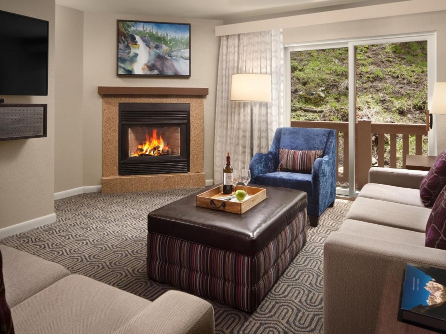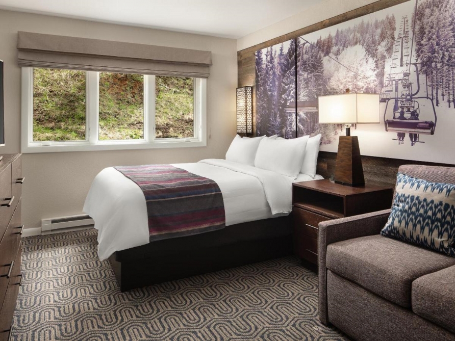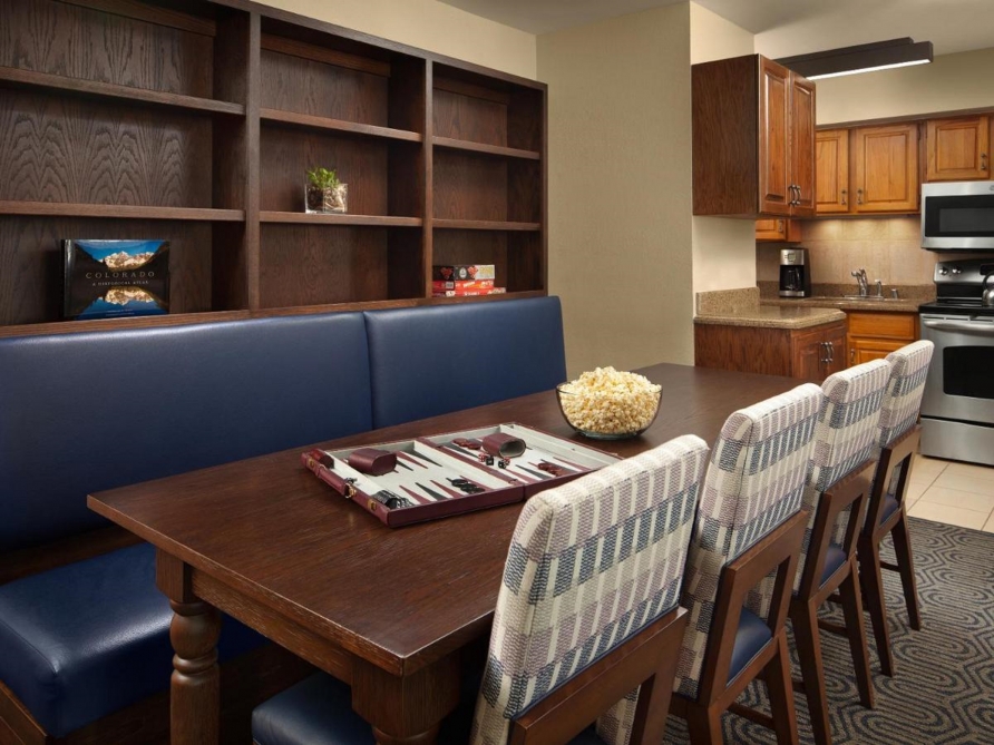 The apartments at Vail have separate living and sleeping areas with large windows viewing the hotel's surroundings. The kitchen is equipped with a stove, dishwasher, and all the necessary silverware and serving dishes.