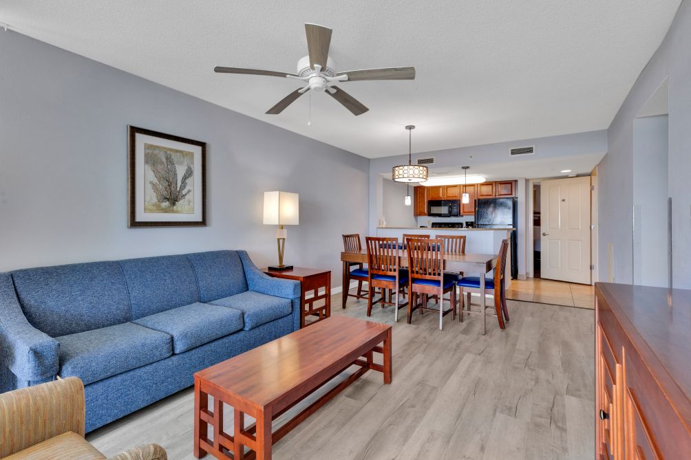 The dining room and full kitchen with granite countertops complete with dishwasher and washer/dryer. The living room comes with a queen-size sofa bed and the most stunning views of the ocean from your own private balcony.