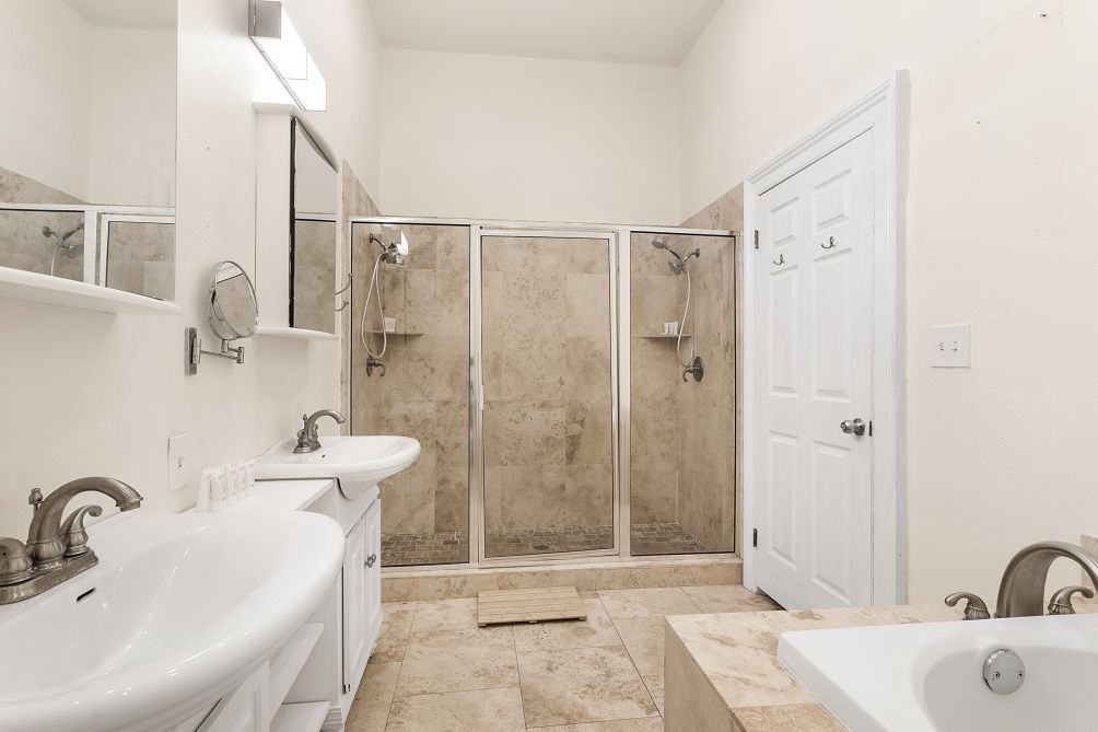• Master bathroom with double sinks with two-person shower heads and a stand-alone bathtub
