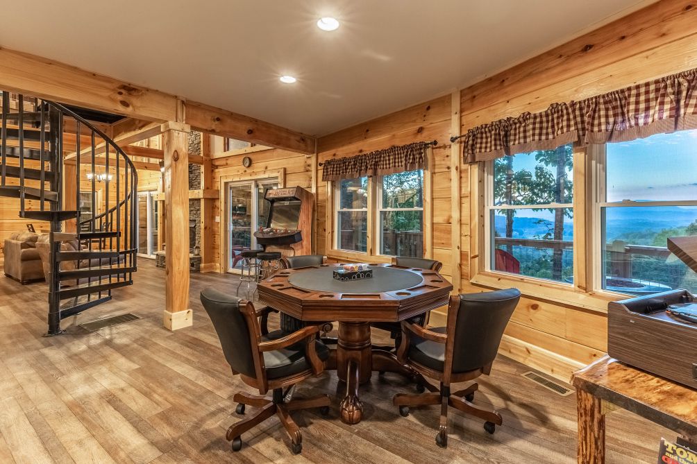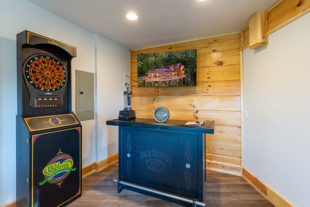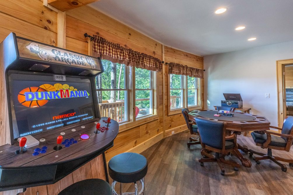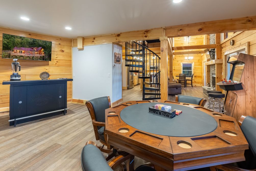 This cabin features a fully-equipped kitchen. The cabin has its own private balcony and patio with outdoor furniture. There is plenty to do in this wonderful cabin, including 4 TVs. The game room has a lot to offer - a bumper pool, poker, arcade-style with classics, and a bar. There is a king bed in the master bedroom, and a queen bed in the second bedroom. En suite bathrooms.