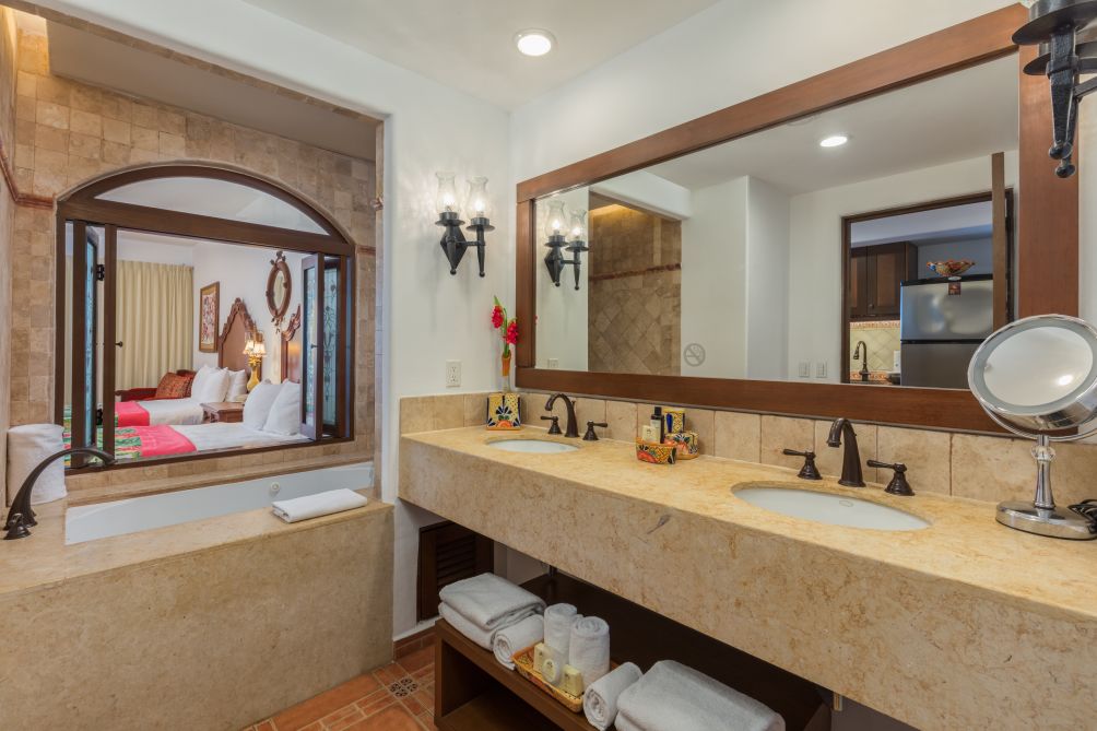 These luxury suites offer you 2 queen beds, a spacious bathroom, a whirlpool, a sitting area, and a kitchenette to cook your meals. Relax on your private balcony with sweeping views of the surroundings of the beautiful Hacienda.