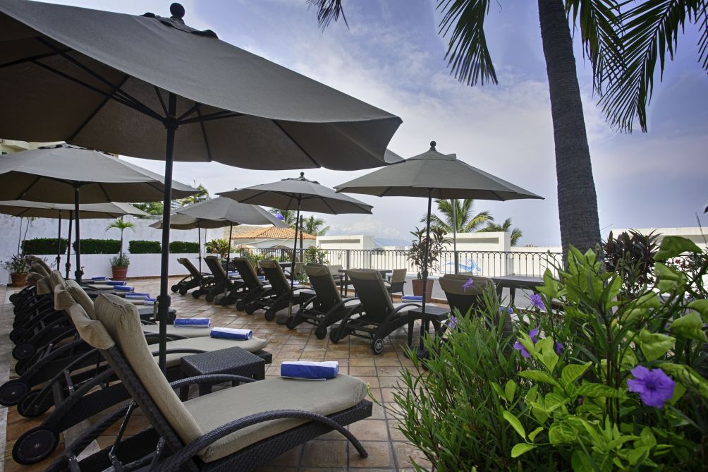 On the second level, this Puerto Vallarta hotel features an attractive outdoor pool with lounge chairs and umbrellas surrounding the waist-high ceramic pool for a cooling afternoon dip, perhaps before a more adventurous leap into the welcoming Los Muertos waves.