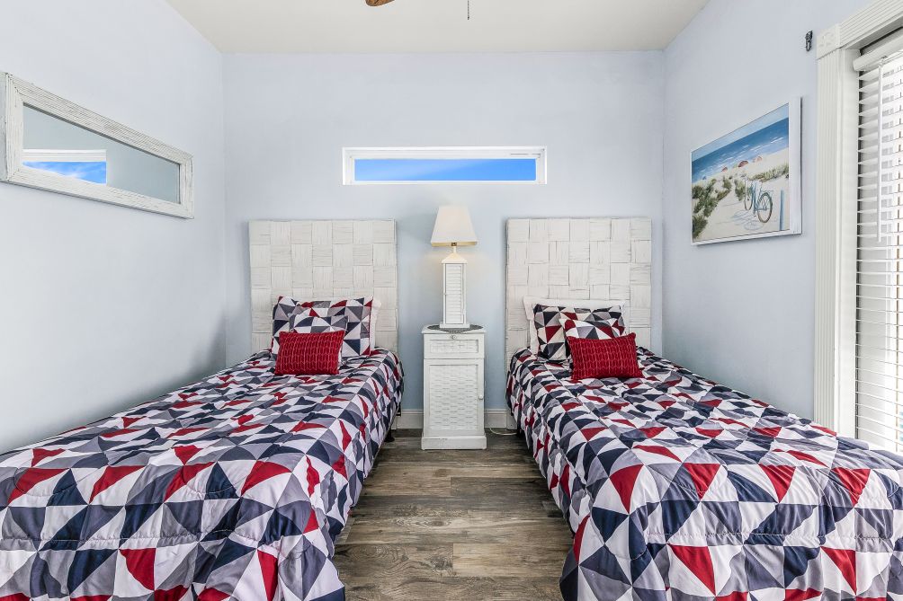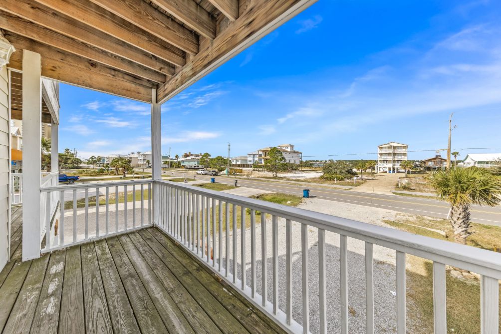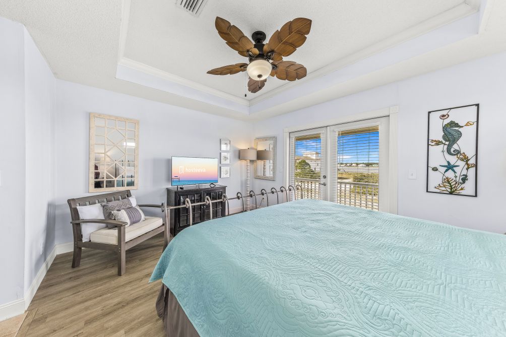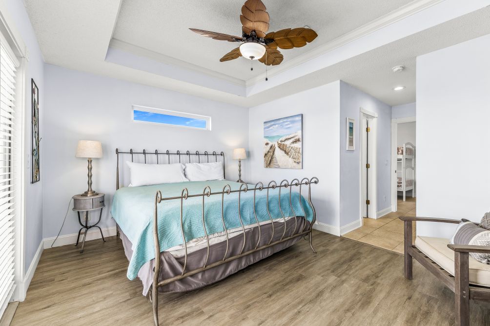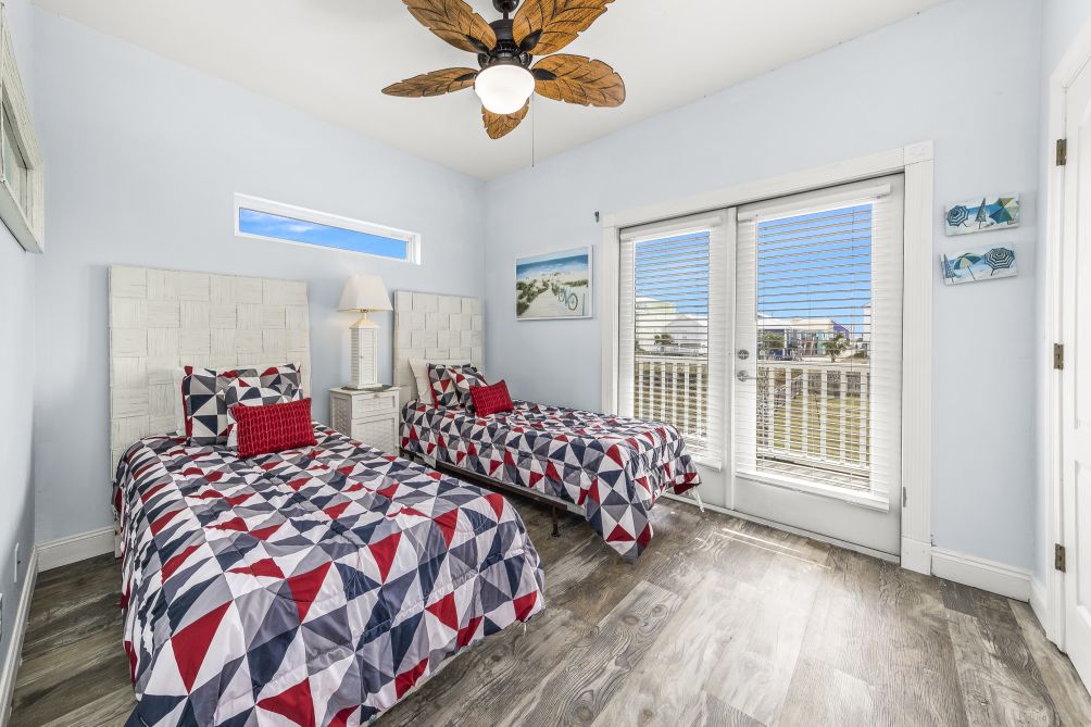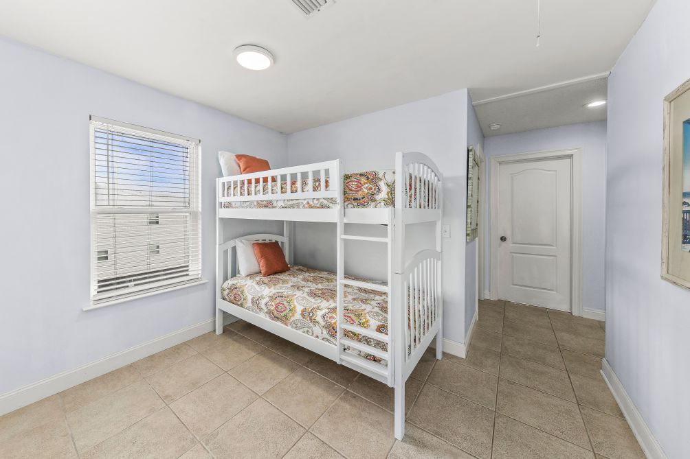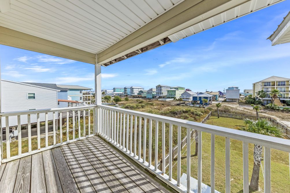 Upstairs you will find built-in bunks beds. On the side of the house is the second guest bedroom with Queen Bed, private bathroom, closet, and private balcony that overlooks the volleyball court, and peek-a-boo views of the gulf. On the North side of the upstairs is the Master Bedroom with King Bed, Private Bathroom, closet, and private balcony with views of Little Lagoon.