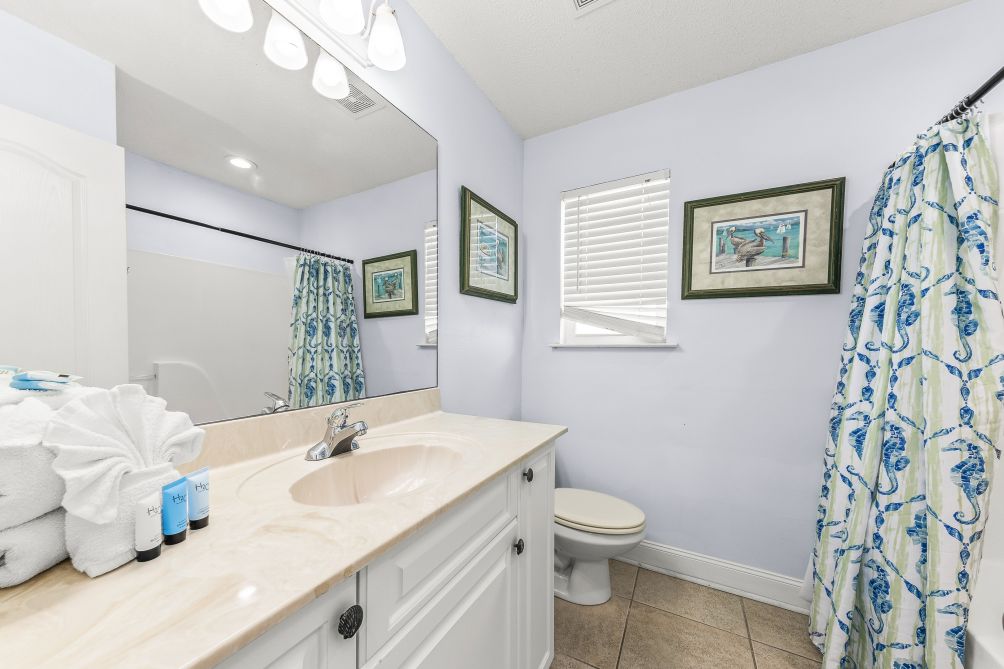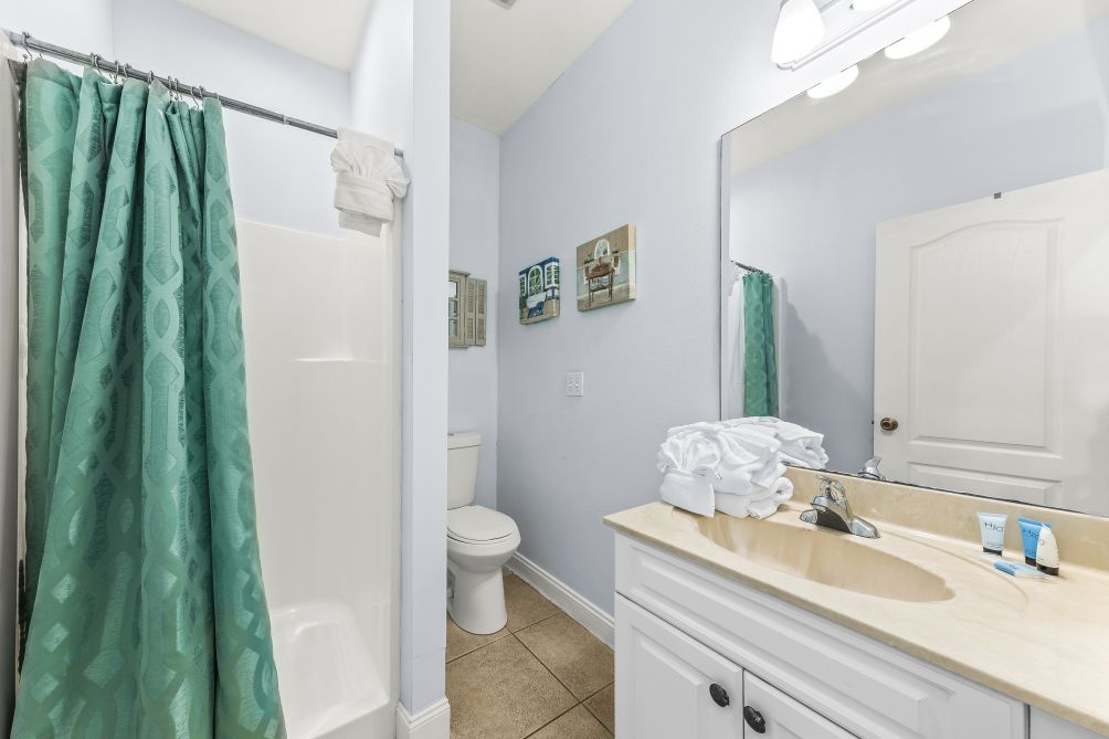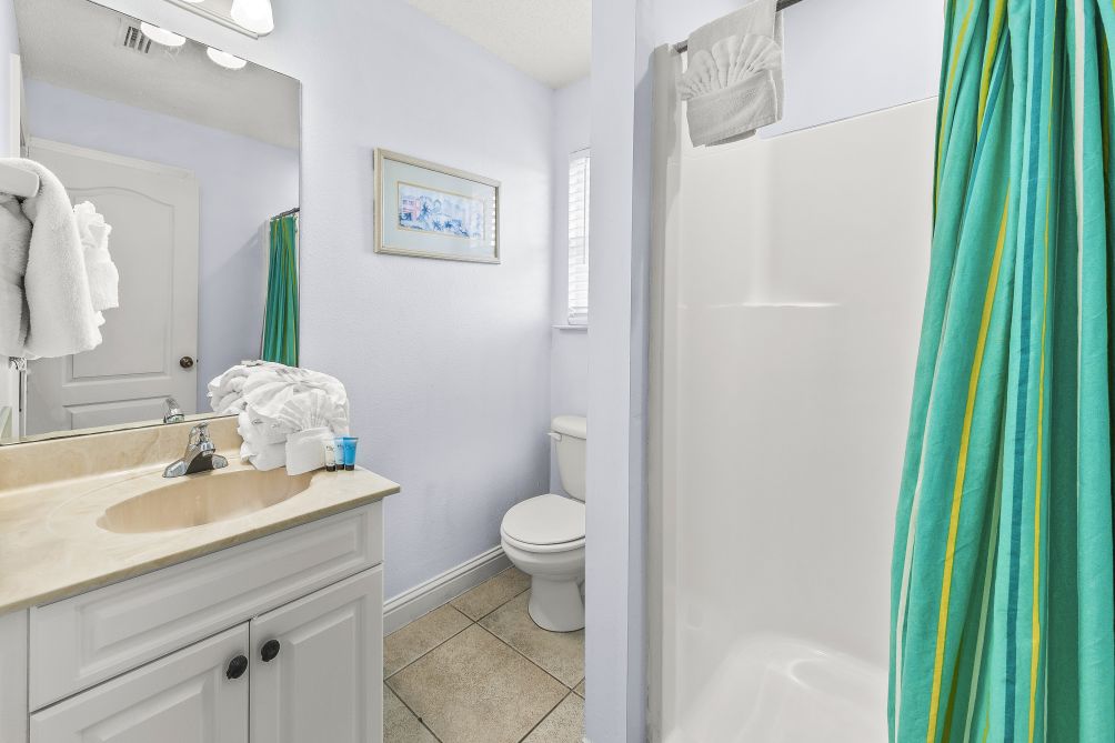 The main level offers a great living area with chairs, coffee table, a four-seat breakfast table, and accesses the rear balcony. The kitchen is fully stocked with all pots, pans, cooking utensils, & plates & glassware you’ll need to make yourself at home. On the downstairs main floor, you will find a guest bedroom with 2 twin size beds and a private balcony with lagoon views. The guest bathroom is right outside the guest bedroom and doubles as the bathroom for the main floor.