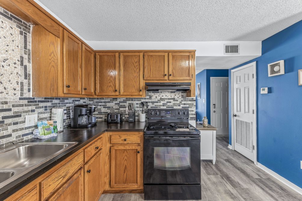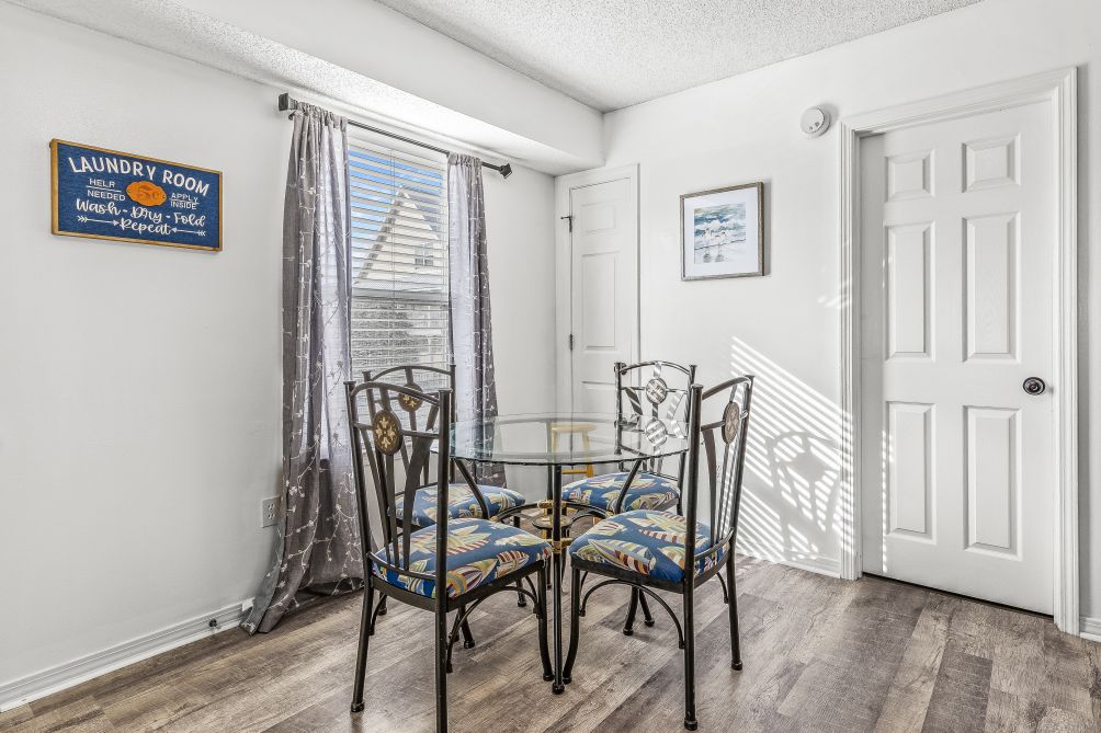 This beach getaway is a 2-level vacation home. First floor comes with an ocean-blue colored living area with a cozy sofa, side table with lamp and matching coffee table. All needed essentials are provided, including in-unit washer and dryer. The kitchen is a welcoming space that allows you to make a home-cooked meal or gather around for some take-out. There are so many restaurants and eatiries close by, you’ll have plenty of options to choose from and enjoy.