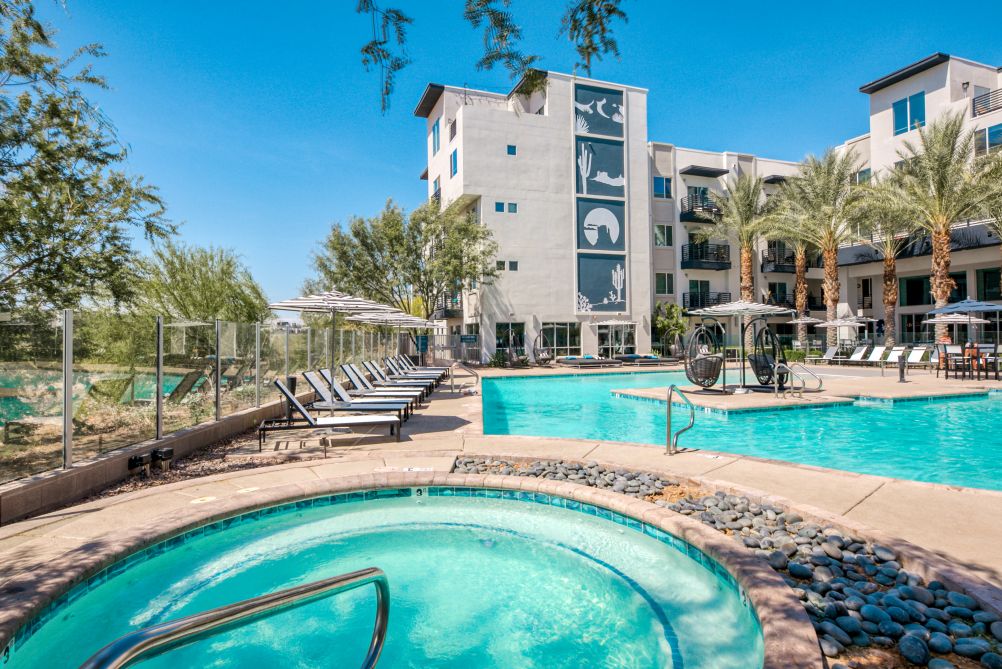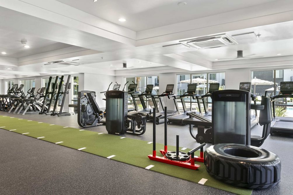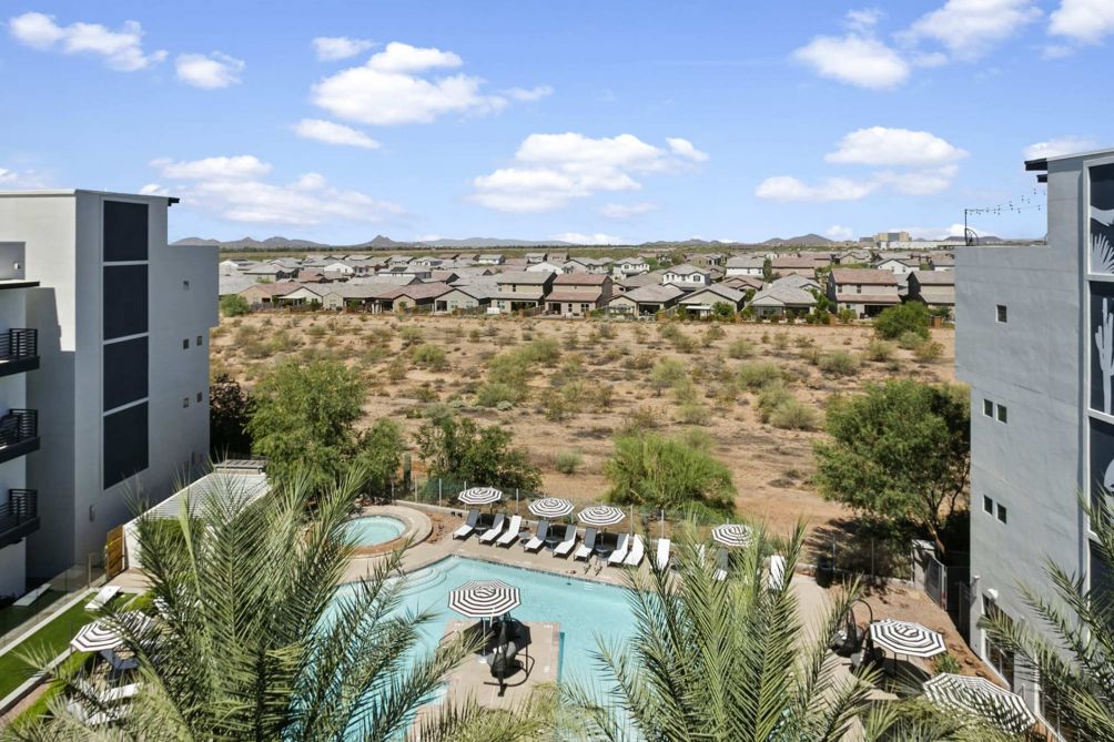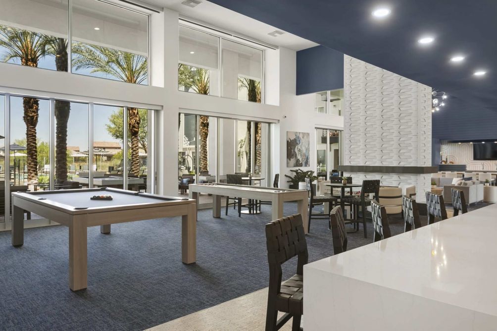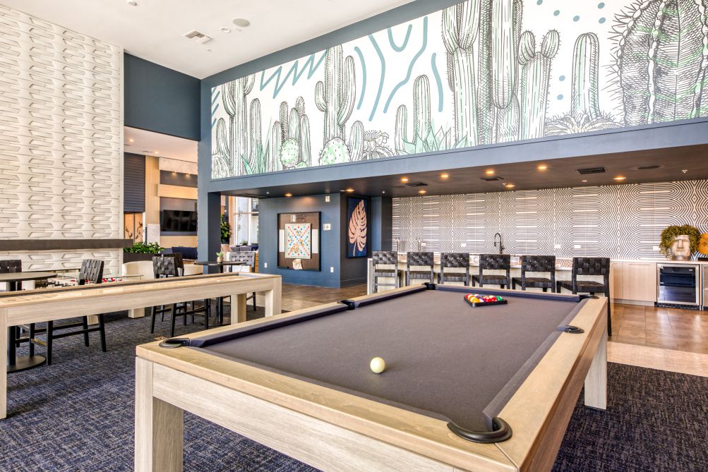 The gated community features a heated pool and spa, 24-hour state of the art fitness center, interior and exterior pool tables and shuffleboard, and even kombucha and cold brew on tap!