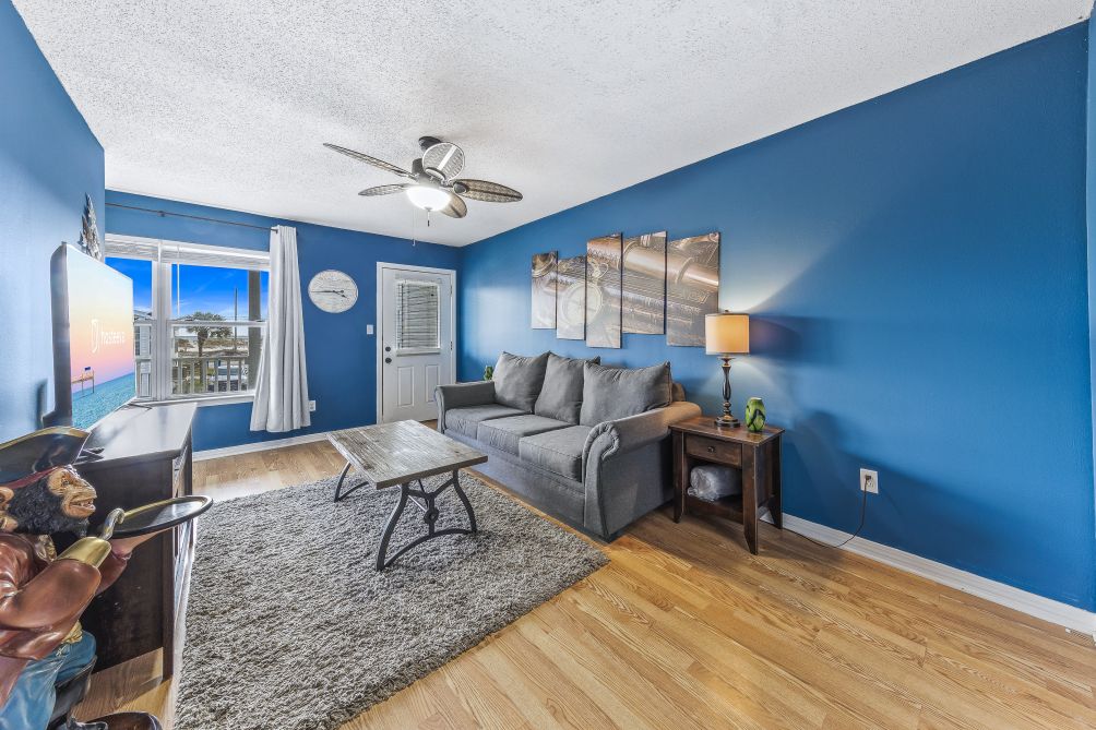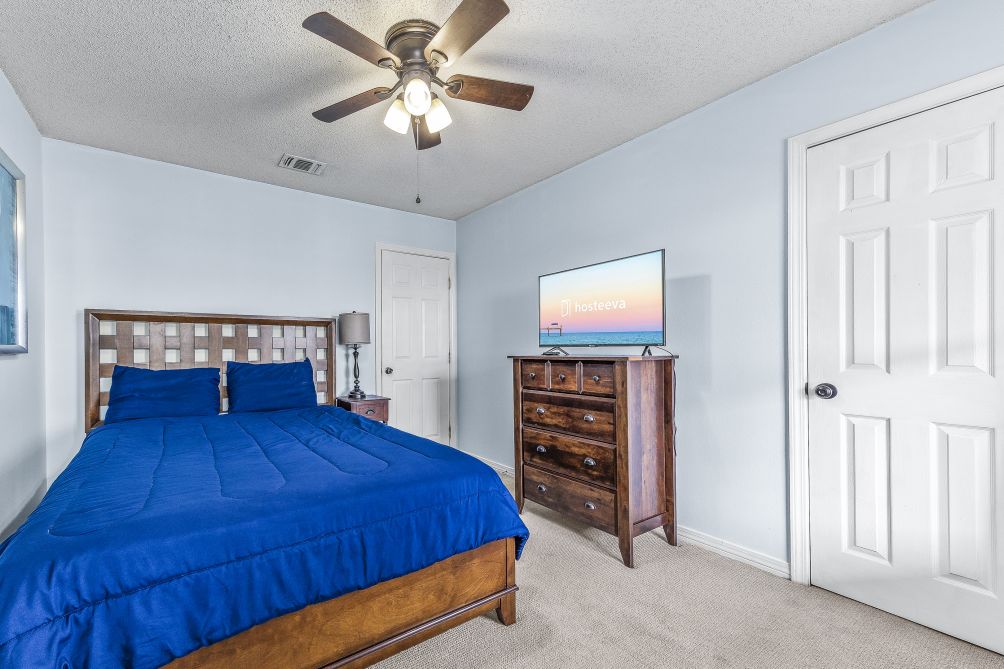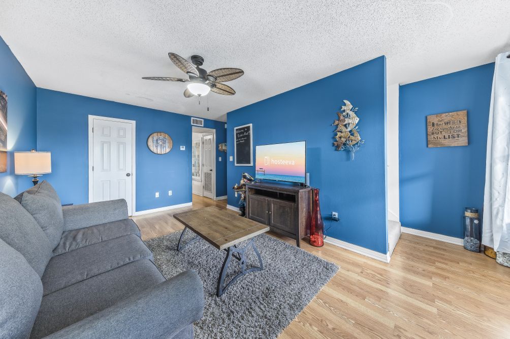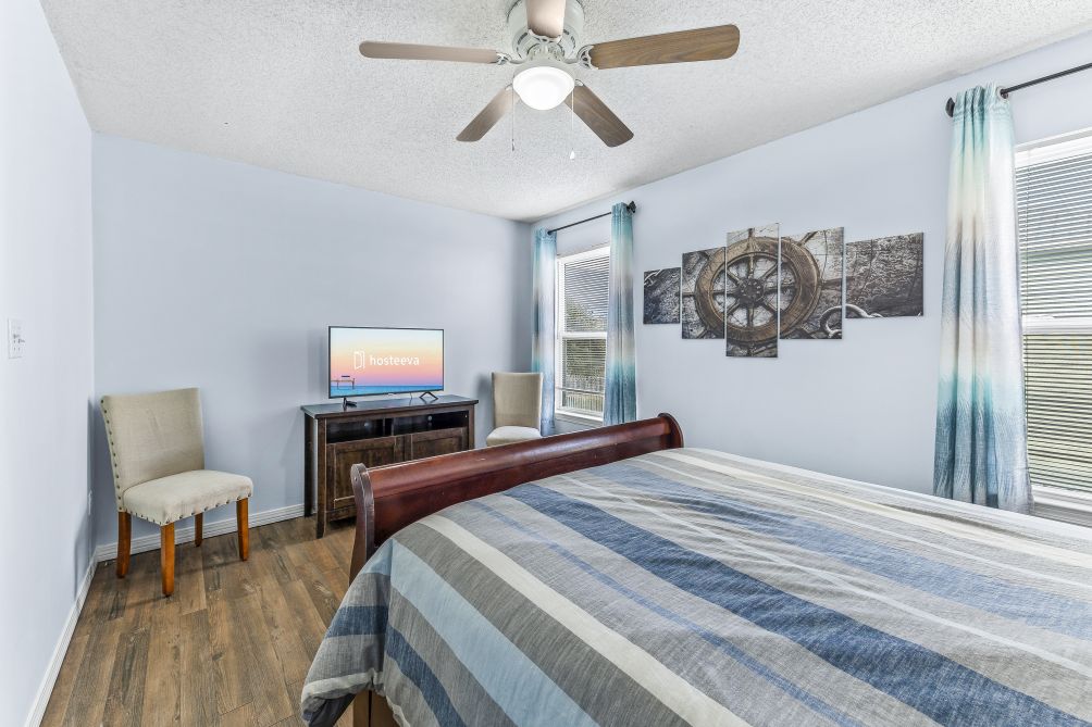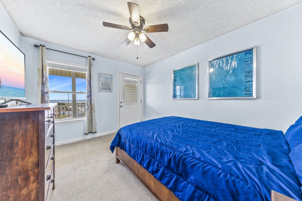 This beach getaway is a 2-level vacation home. The first floor comes with an ocean-blue-colored living area with a cozy sofa, a side table with a lamp, and a matching coffee table. All needed essentials are provided, including an in-unit washer and dryer. The kitchen is a welcoming space that allows you to make a home-cooked meal or gather around for some take-out. There are so many restaurants and eateries close by, you’ll have plenty of options to choose from and enjoy.