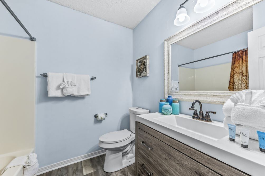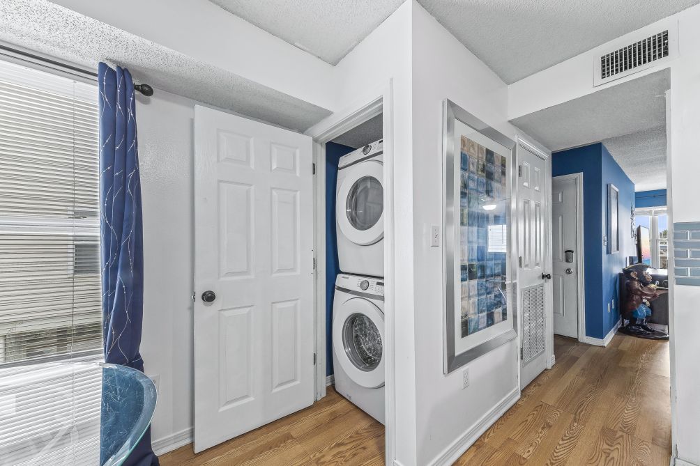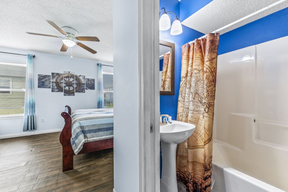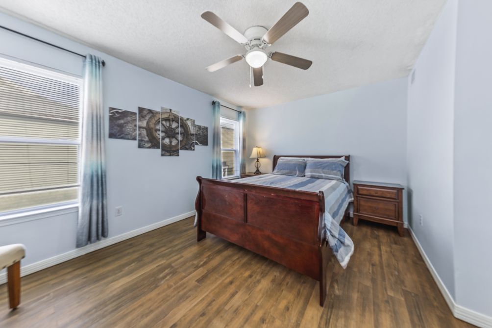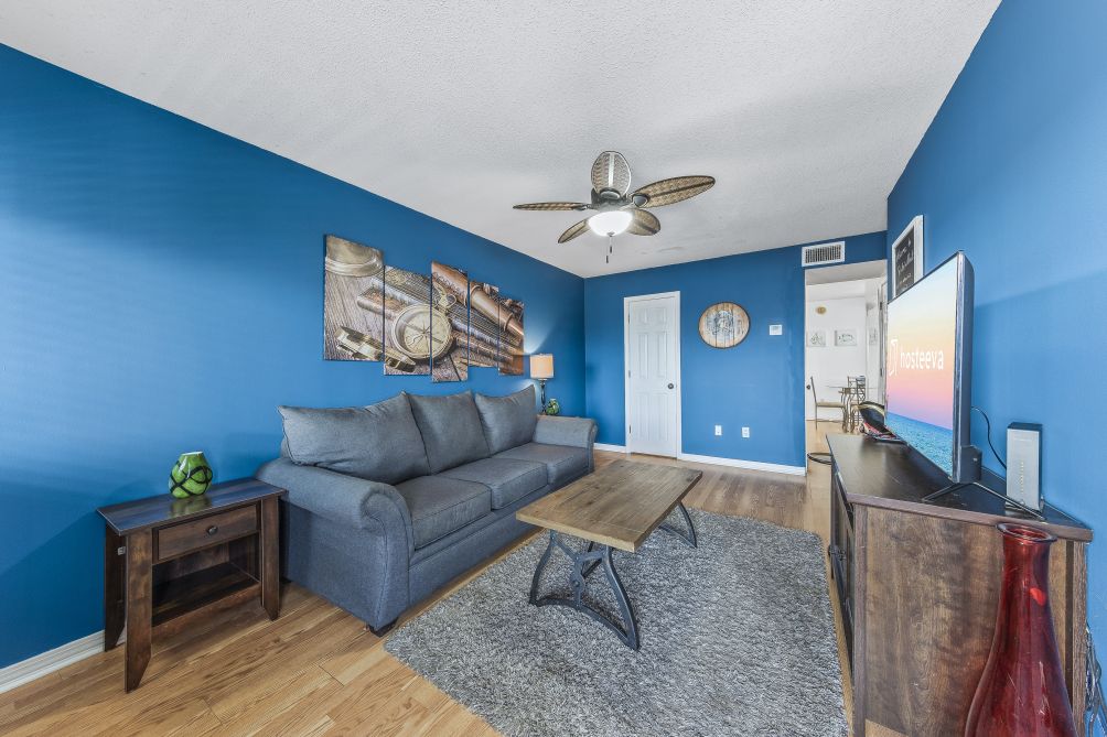 This beach getaway is a 2-level vacation home. The first floor comes with an ocean-blue-colored living area with a cozy sofa, a side table with a lamp, and a matching coffee table. All needed essentials are provided, including an in-unit washer and dryer. The kitchen is a welcoming space that allows you to make a home-cooked meal or gather around for some take-out. There are so many restaurants and eateries close by, you’ll have plenty of options to choose from and enjoy.