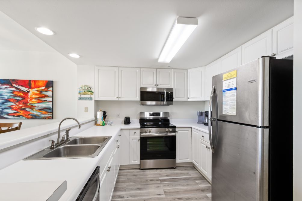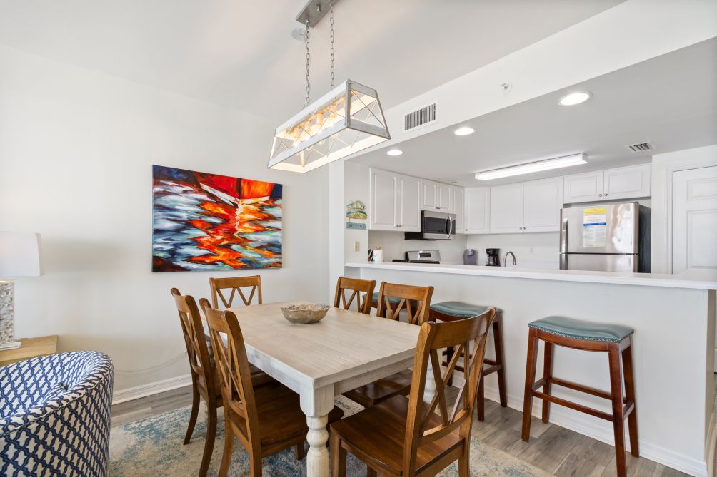 The kitchen is fully equipped with all Stainless Steel Frigidaire appliances including a full-size refrigerator/freezer with ice maker, dishwasher, microwave oven, stove/oven, toaster, blender, coffeemaker (both Keurig and drip), mixer, and a raised bar. A dining area with seating for 6, as well as, a raised bar with 3 stools is adjacent to the kitchen. All kitchen utensils and dishware are supplied.