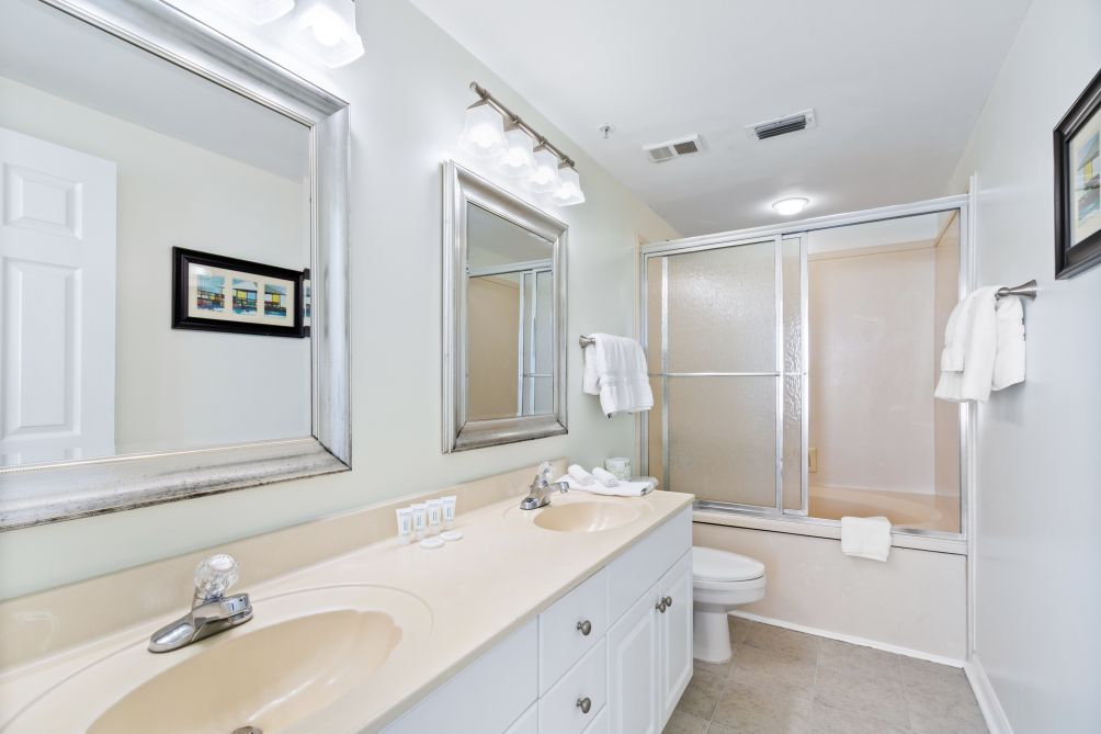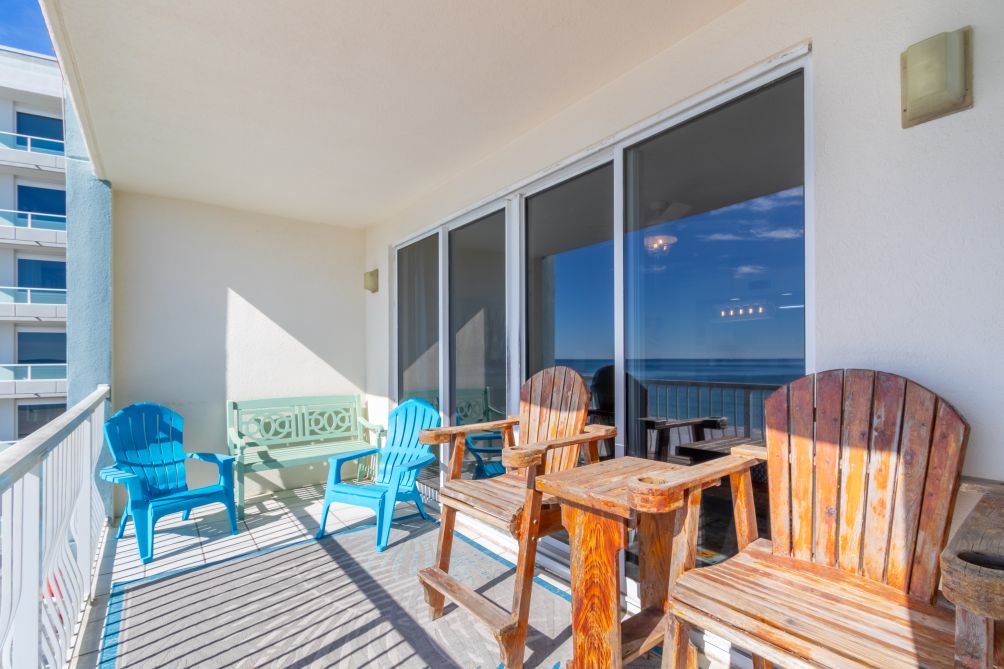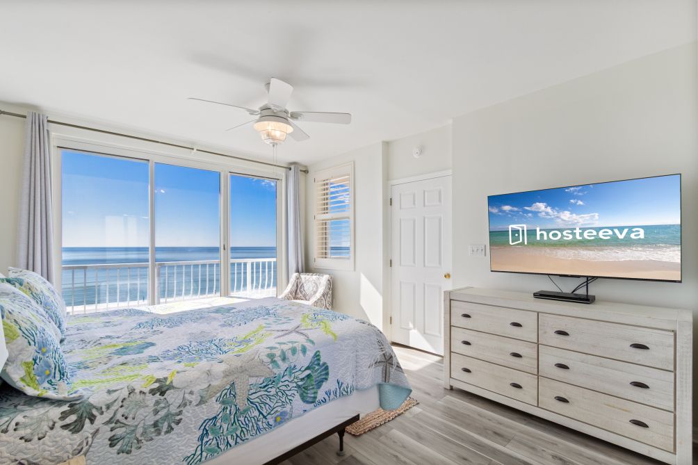 The Master Bedroom, with walk-in closet, contains a king-size bed, night stand, dresser and 32-inch Flatscreen HDTV. The master bath features a garden tub/shower combination of cultured marble and his-and-hers sinks. The master bedroom looks out over the Gulf with sliding, glass, door entry to a balcony with endless views.