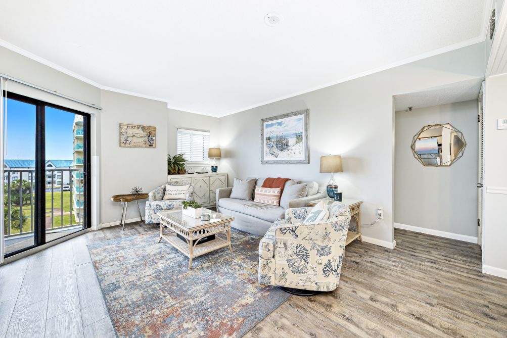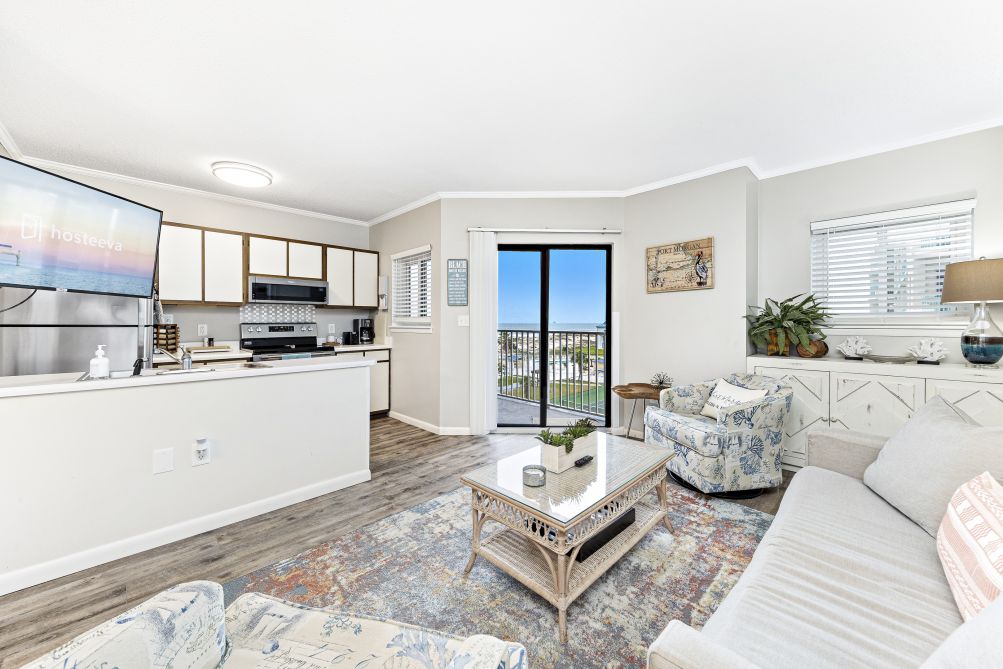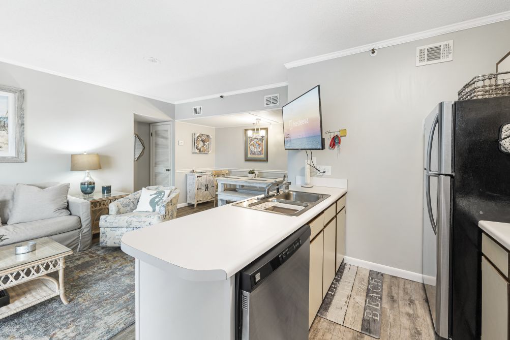 Inside the condo, guests will find a beautifully furnished living room with comfortable seating and a large flat-screen TV. The fully equipped kitchen features modern appliances and everything guests need to prepare meals during their stay.