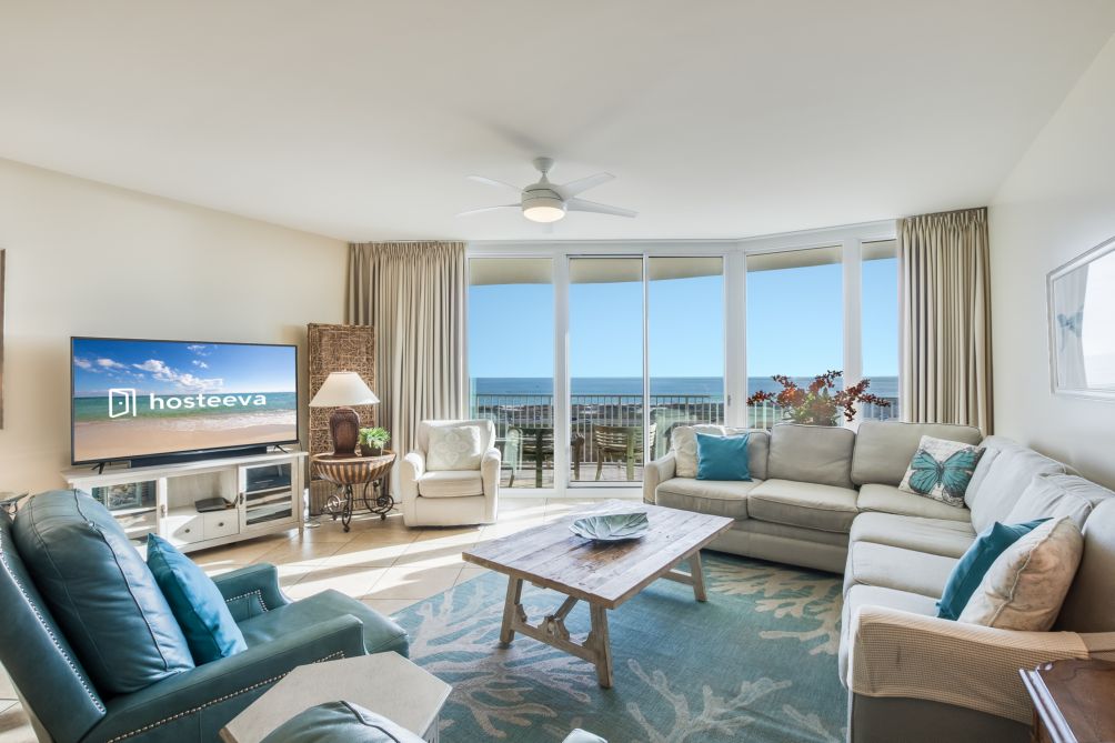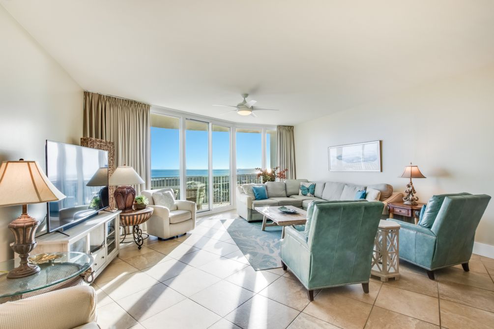 The inviting living room features abundant natural light streaming in through floor-to-ceiling windows, offering glimpses of the spacious balcony and the mesmerizing Gulf of Mexico. The living area is both luminous and roomy.