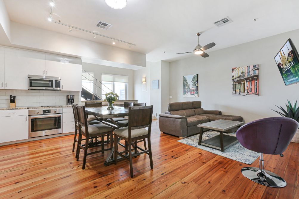 The penthouse features two levels with a living/dining room and a fully functional state of the art kitchen on the first level and bedrooms on the second level. The spacious terrace with NOLA skylines allows for a great small gathering of friends or a sunset watching for 2 on that special date night.
