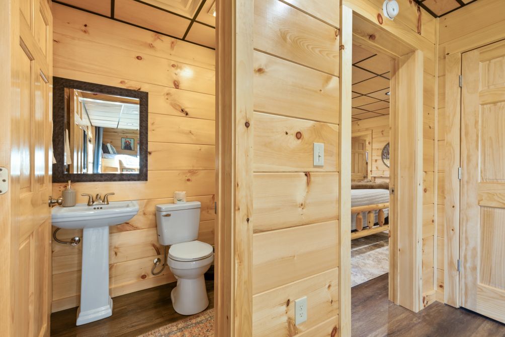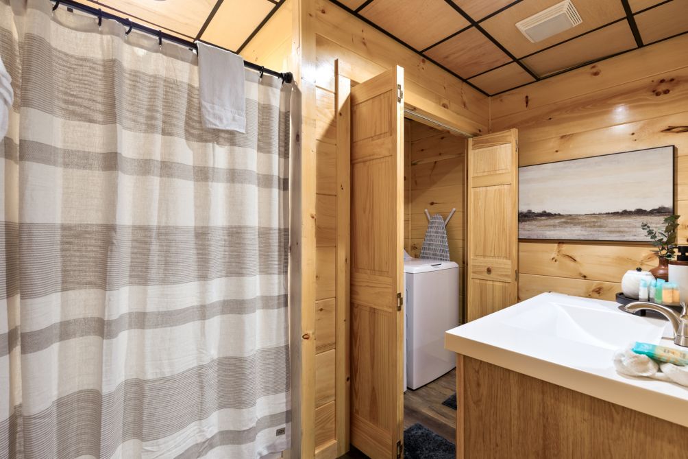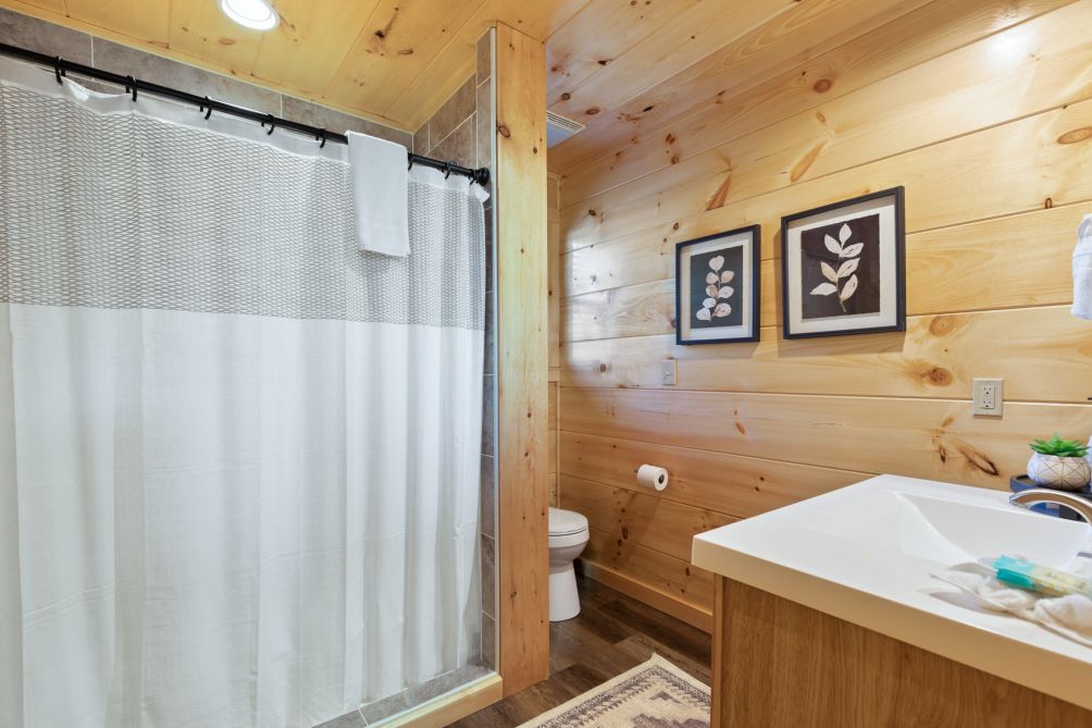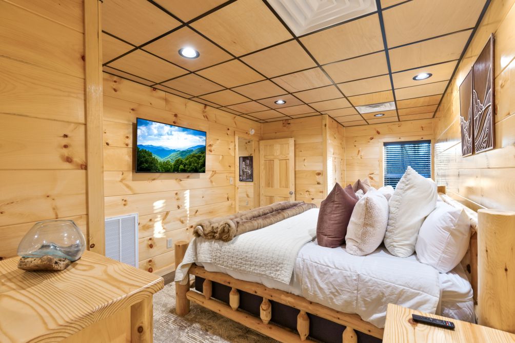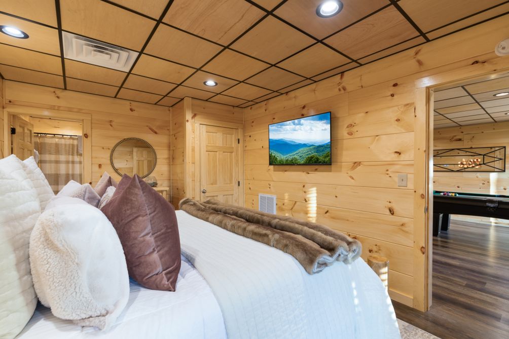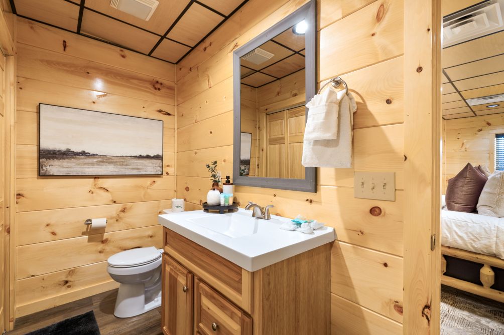 Comfortable bedrooms await on the second floor, each equipped with its own Smart TV for added convenience. A private balcony offers the perfect spot to enjoy morning coffee or relax while stargazing under the Tennessee sky.