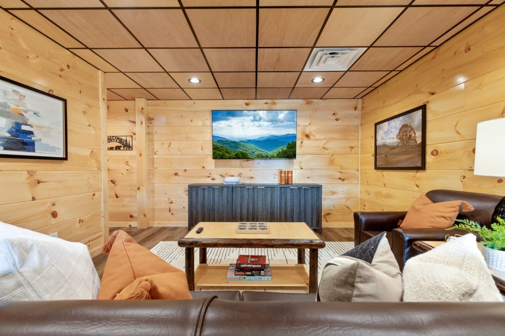 As you step inside, you'll be greeted by a cozy living room featuring a 60-inch Smart TV, ideal for unwinding with a movie or your favorite shows. Downstairs, another spacious living area awaits, complete with a lavish 65-inch Smart TV, perfect for larger gatherings or peaceful evenings with loved ones.