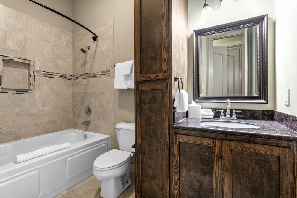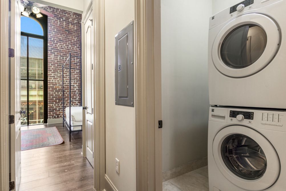 The bedroom offers a plush mattress with premium linens, ensuring a restful night’s sleep, while the sleek bathroom is stocked with fresh towels and essential toiletries. A washer and dryer are conveniently located in the living space, so you can pack light and stay fresh throughout your visit.