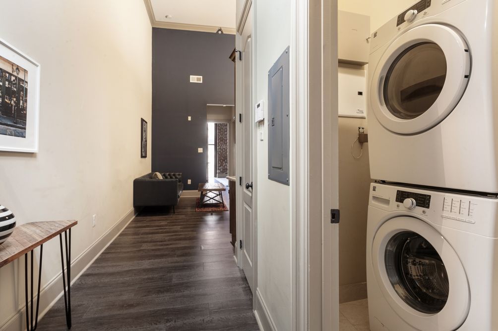The bedroom offers a plush mattress with premium linens, ensuring a restful night’s sleep, while the sleek bathroom is stocked with fresh towels and essential toiletries. A washer and dryer are conveniently located in the living space, so you can pack light and stay fresh throughout your visit.