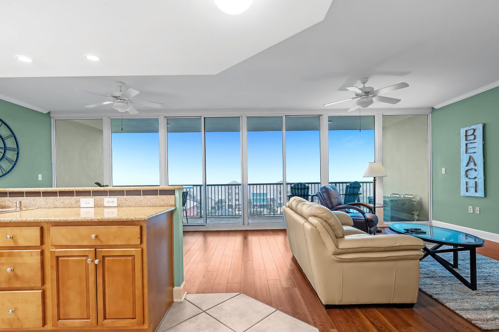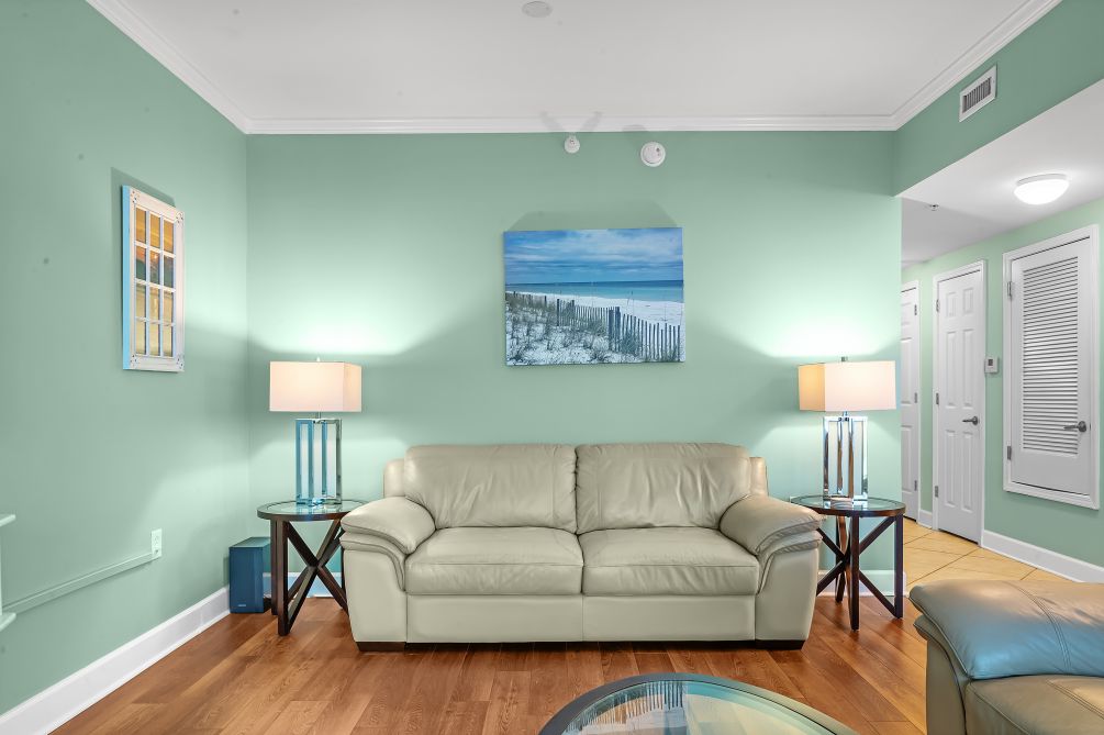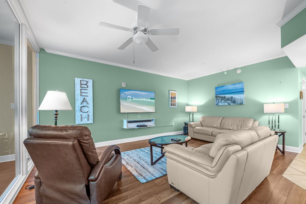 The open concept living room is a cozy spot, large with a television for entertainment and relaxation. Here you can stay connected with high-speed internet, share your beachside moments and savor the sea breeze on your private balcony.