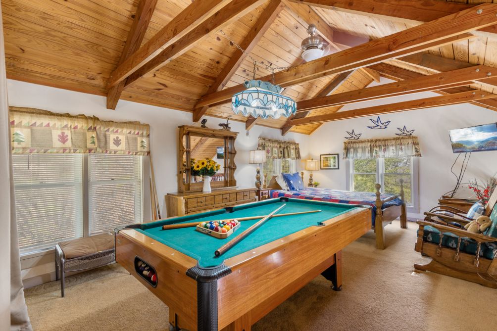 This cabin is close to town but secluded to where you have your own space in the mountains. Whether you're seeking a peaceful retreat or an adventure-filled getaway, our 2-bedroom cabin in Sevierville, Tennessee, provides the perfect setting for your vacation. With its wooded views, balcony, fully equipped kitchen, flat-screen TV, pool table, and fireplace, it's sure to make your stay unforgettable.