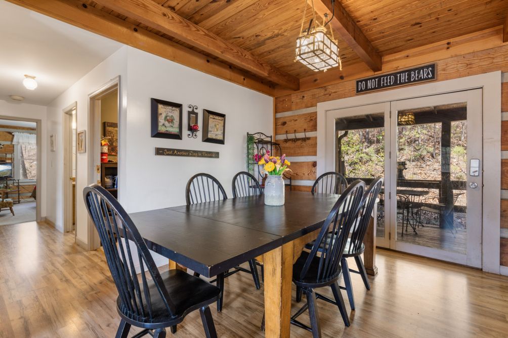 The fully equipped kitchen awaits your culinary adventures, boasting modern appliances and ample counter space. Whether you're preparing a hearty breakfast or whipping up a gourmet dinner, cooking here is a pleasure. Adjacent to the kitchen, a dining area provides a lovely setting to enjoy meals together, with large windows offering picturesque views of the surrounding woods.