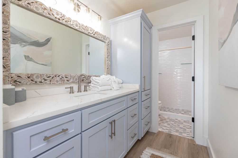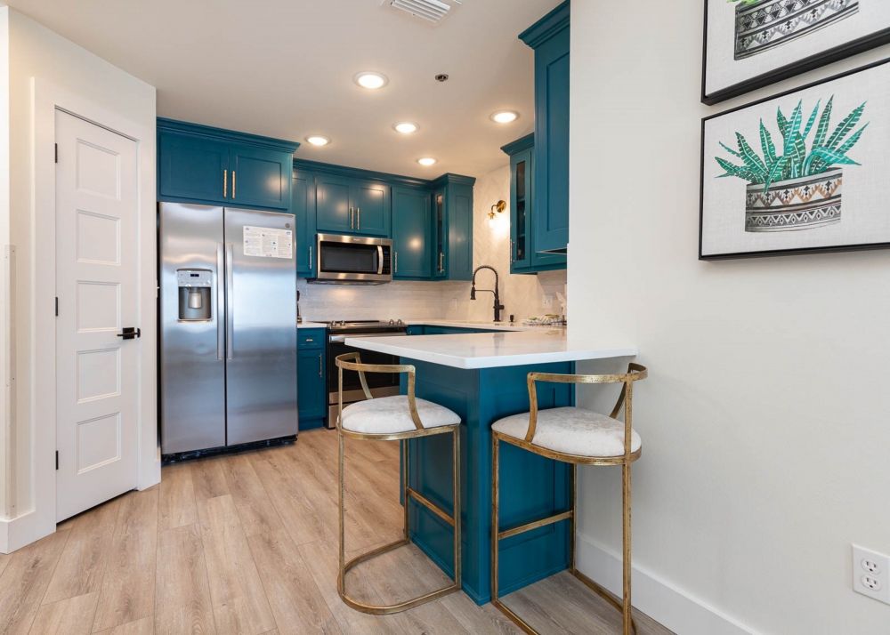 The living area is a haven of comfort, creating an ideal space for relaxation after a day in the sun. Adjacent to the living room is a fully equipped kitchen with top-of-the-line appliances, granite countertops, and ample cabinet space. Whether you're preparing a gourmet meal or simply enjoying a morning coffee, this kitchen is sure to delight any chef.