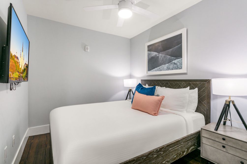 Enjoy the convenience of in-unit laundry facilities, high-speed Wi-Fi, and flat-screen TVs in both the living area and two bedrooms. Large windows flood the space with natural light, enhancing the warm and welcoming atmosphere.