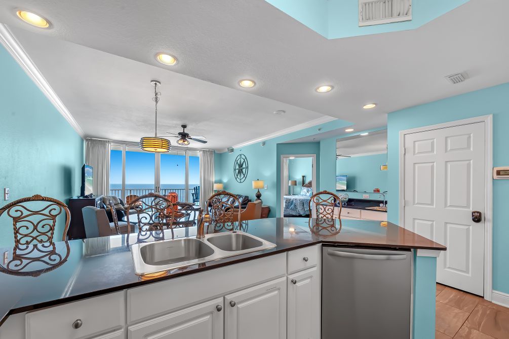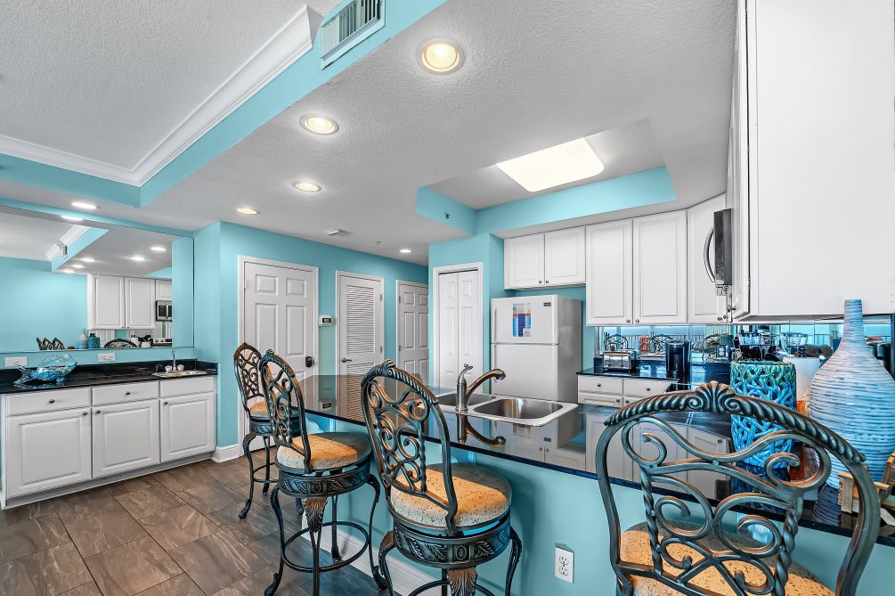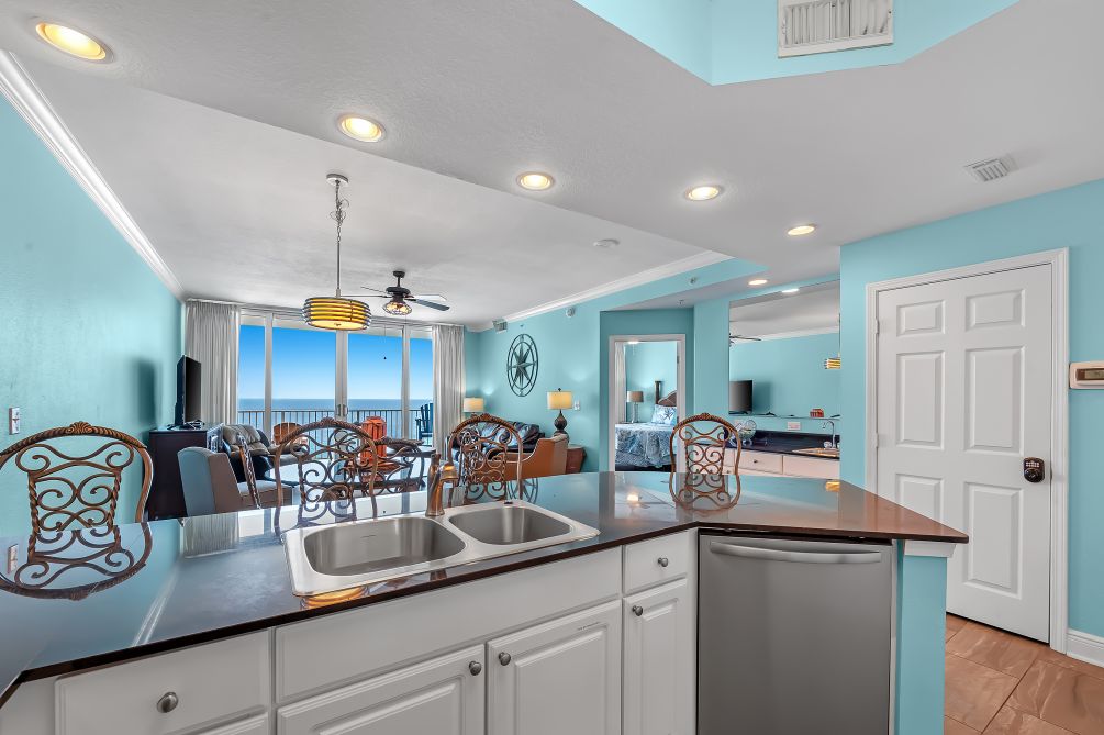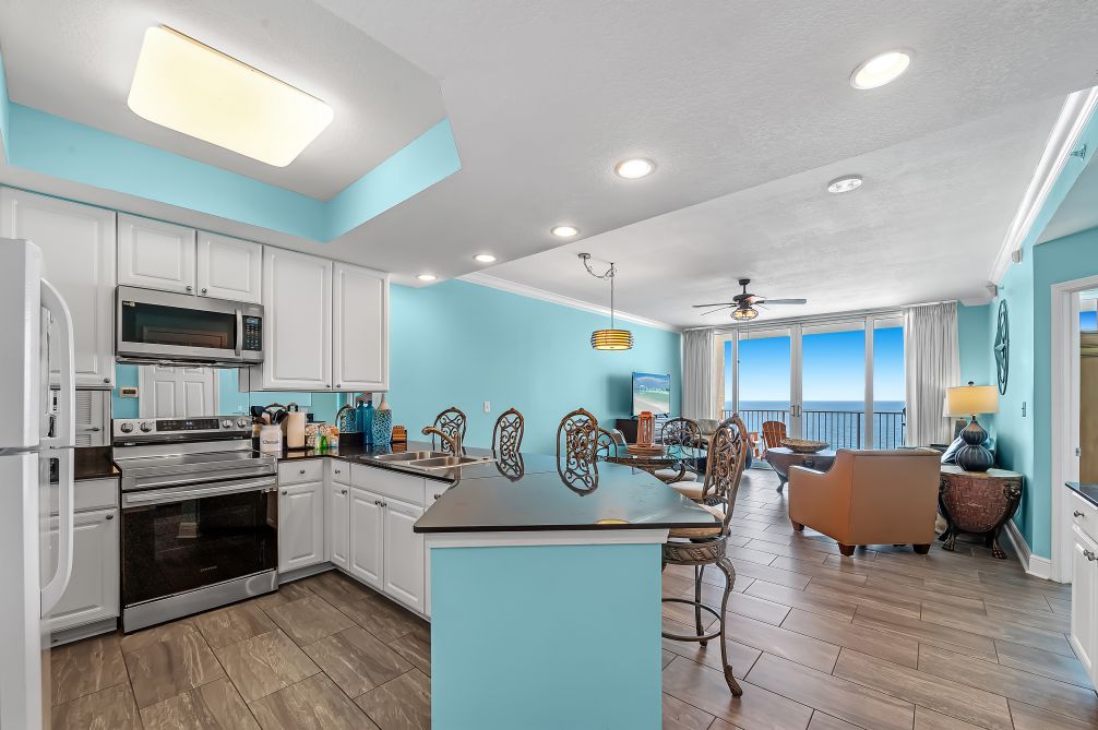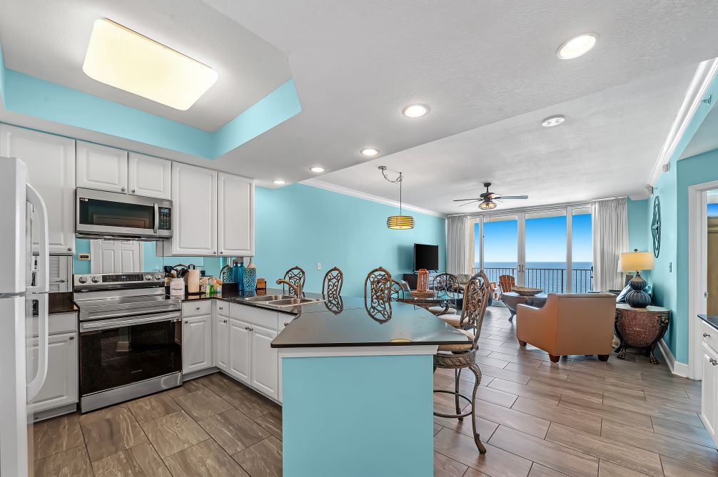 Enjoy a fully equipped kitchen with modern appliances, perfect for cooking your favorite meals. Step out onto the furnished balcony to enjoy your morning coffee. The Gulf front balcony is perfect for evening cocktails while soaking in the panoramic views and gentle gulf breeze.