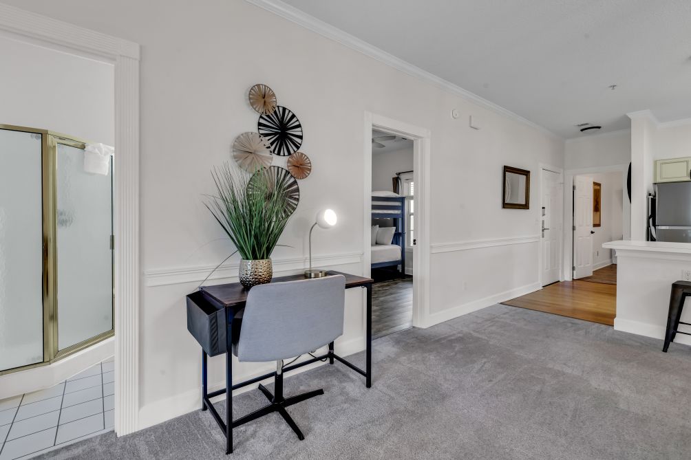 Upon entering, you'll be greeted by an open-concept living area that is tastefully furnished and designed for relaxation. The living room features cozy seating, a flat-screen TV, and large windows that flood the space with natural light.