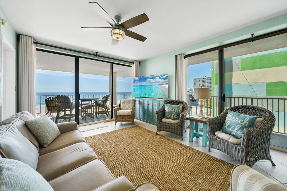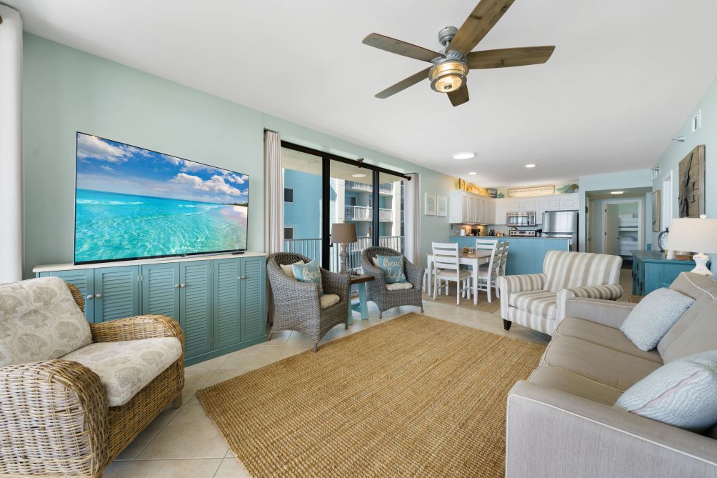 Inside, the open-concept living area is designed for both comfort and style, featuring comfortable seating, a large flat-screen TV, and seamless balcony access—perfect for morning coffee with a view or sunset cocktails. As a corner unit, this condo offers enhanced privacy and ample