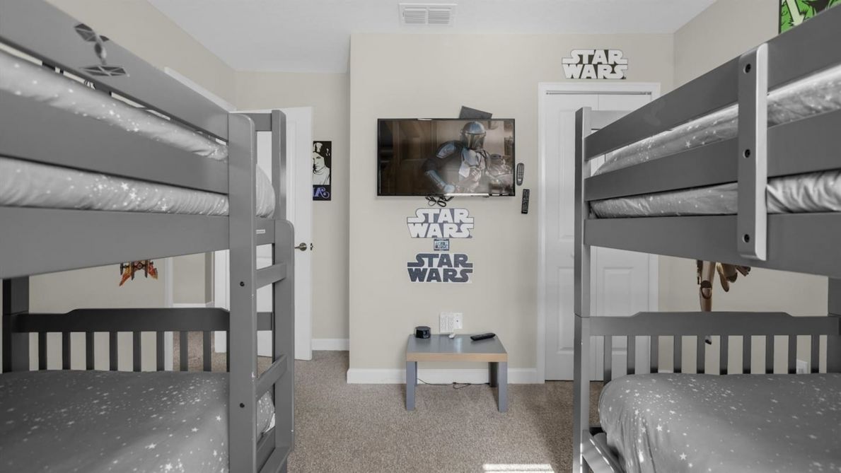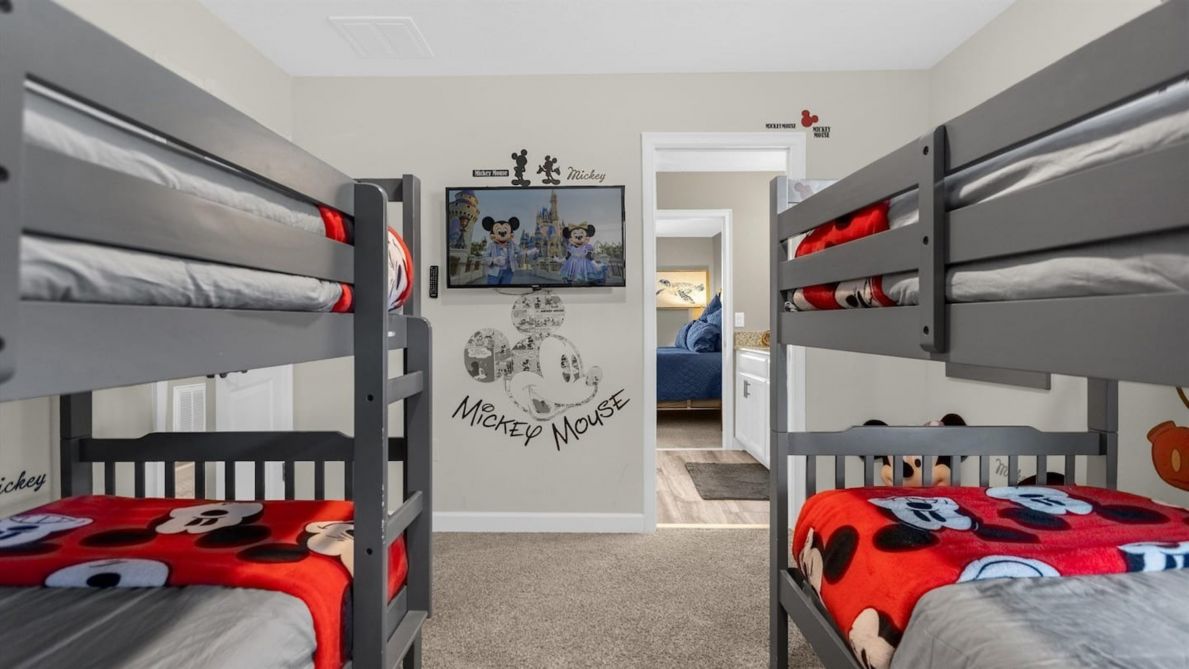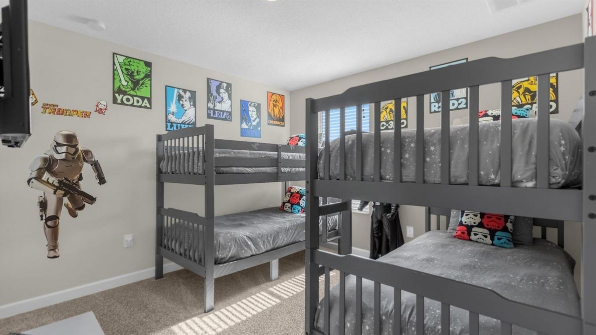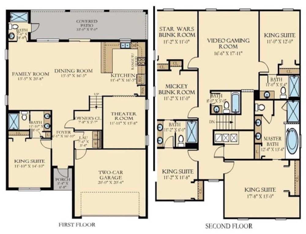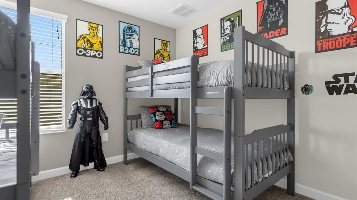 The five upstairs bedrooms are set to appeal to families travelling together by combining one King Suite with a Disney Themed Bunk suite sharing a jack-and-jill full bathroom. There is the enlarged Owner’s en suite featuring its own soaking tub as well as two other king ensuites and a second Star Wars-themed bunk room that utilizes a full bathroom across the hallway, accounting for 3 king suites, two themed bunk rooms and four full baths upstairs.