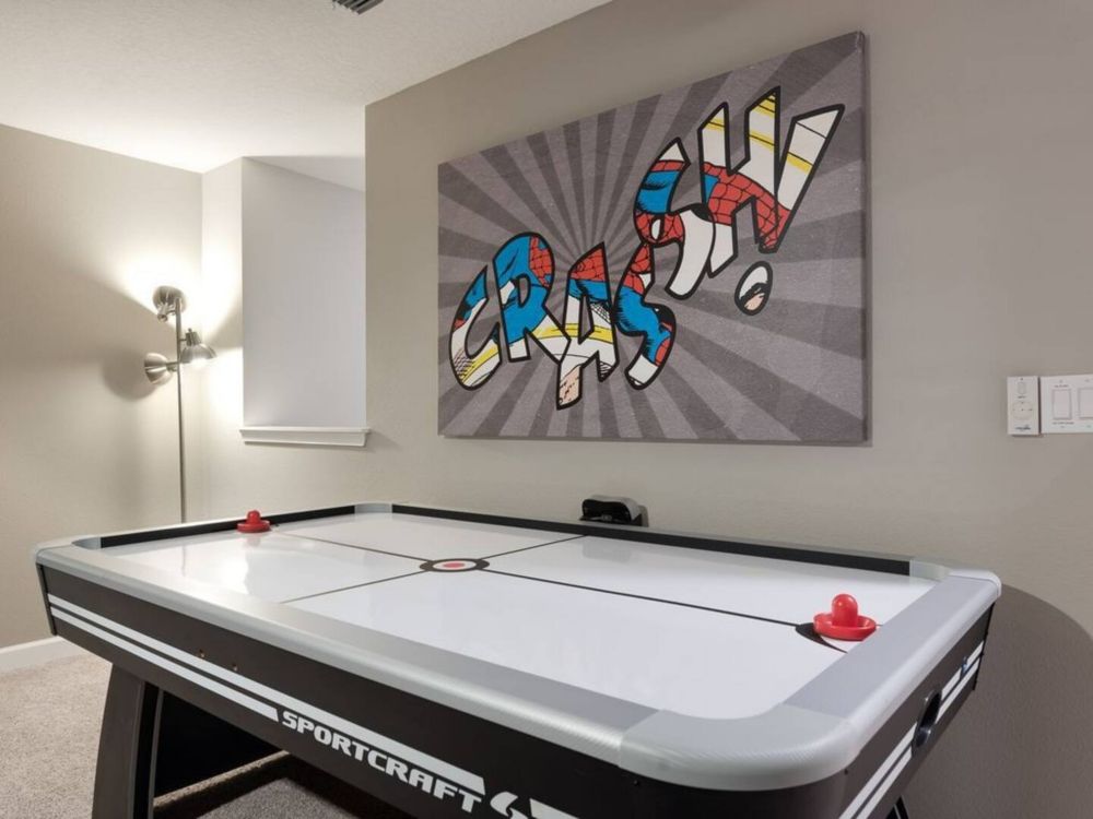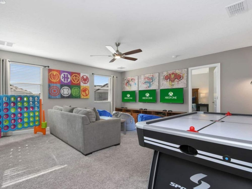The upstairs opens in the Avengers game room outfitted with side-by-side side TVs each with its own Xbox gaming console and one with a PS4 console so you can compete for side by side utilizing our high speed >400Mbs internet There is also air hockey and connect four