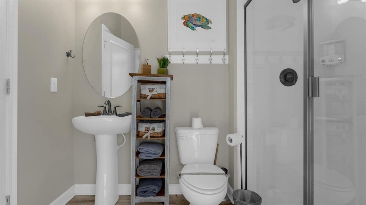 There is a full bathroom off the gathering room that opens to the lanai allowing for private water closet use while swimming or quick secluded dry off and change after swimming