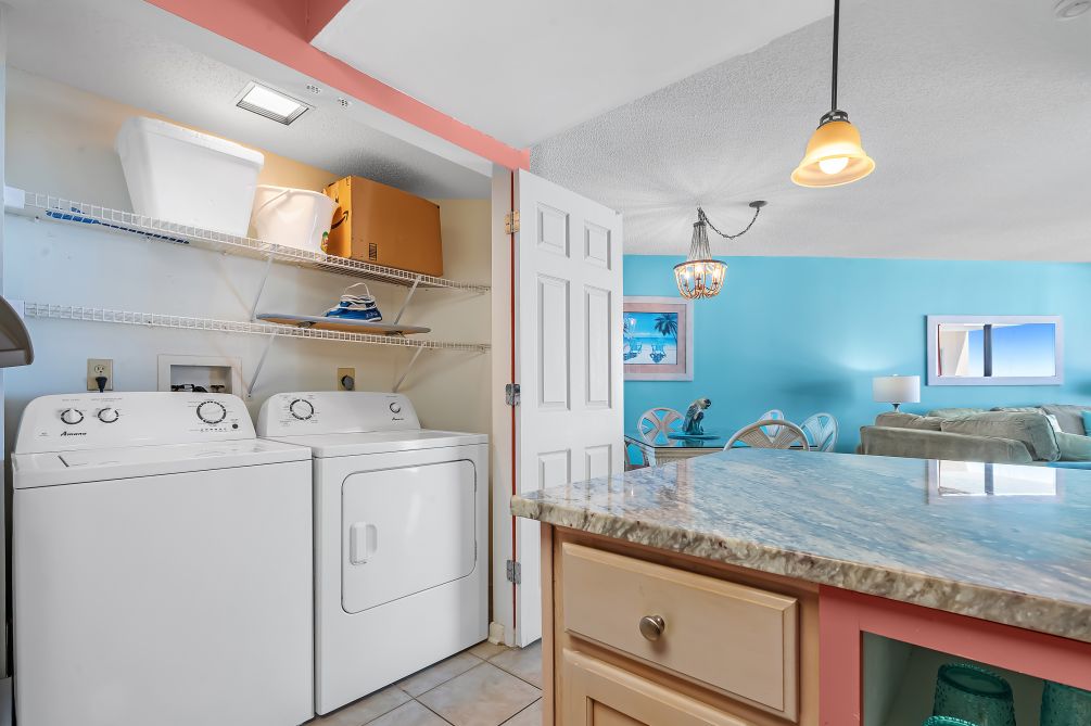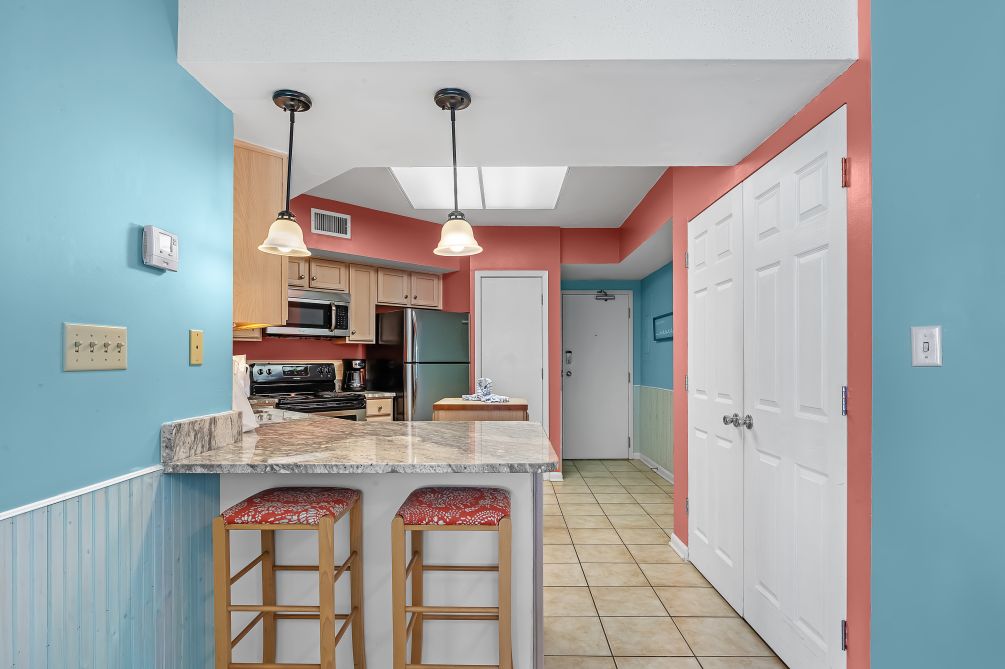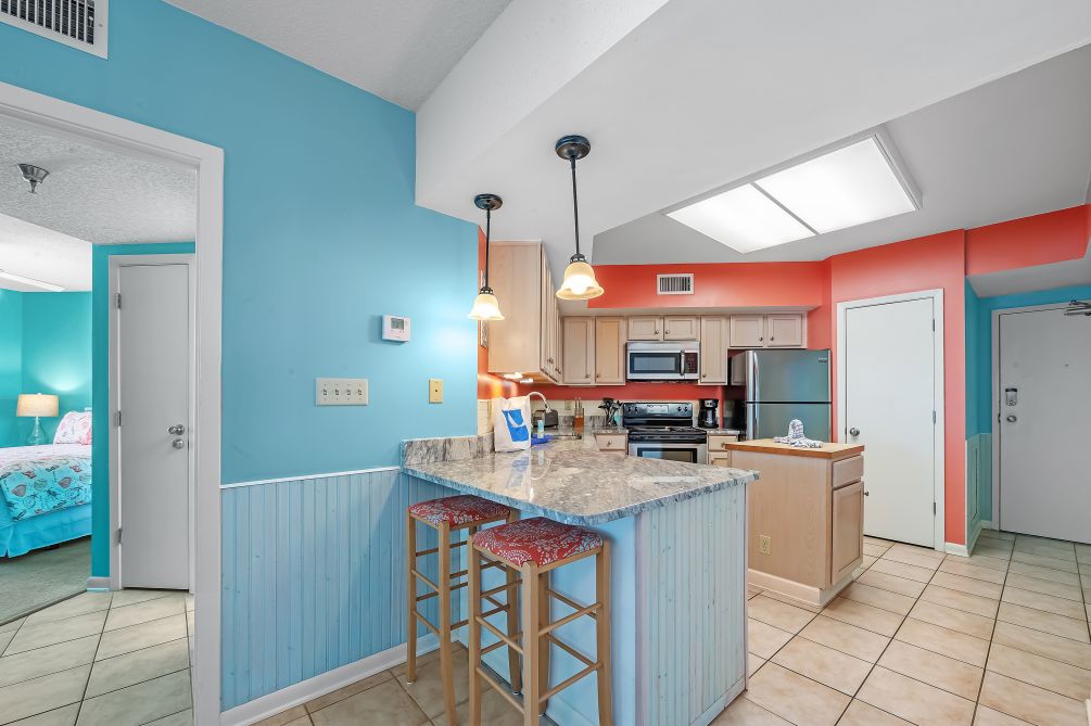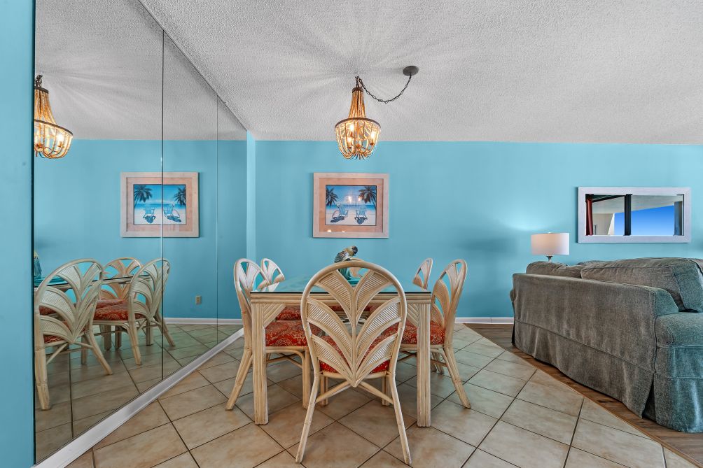 The fully equipped kitchen has everything you need to prepare delicious meals, making dining in a convenient option. Adjacent to the kitchen, you'll find a comfortable dining area, perfect for enjoying meals together.  Here you can enjoy amazing beach views from the private balcony.
