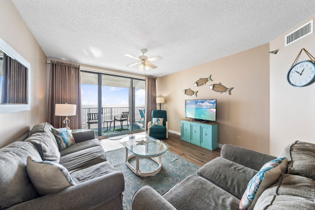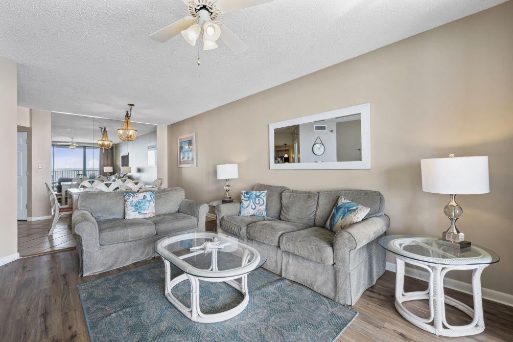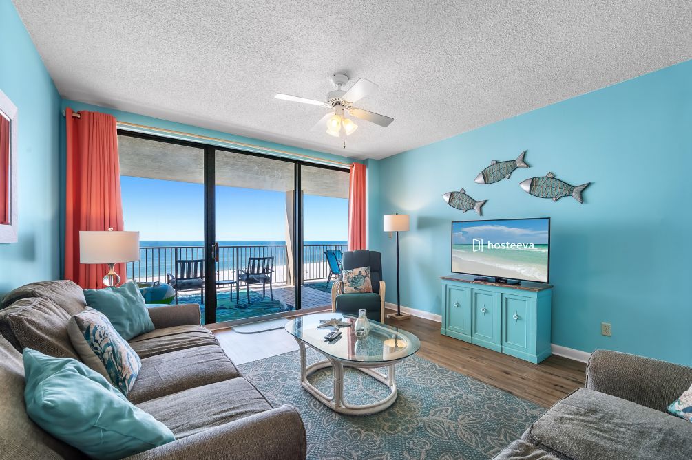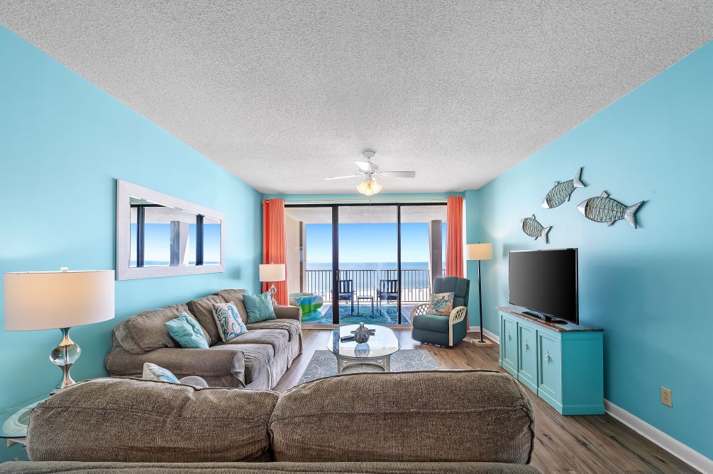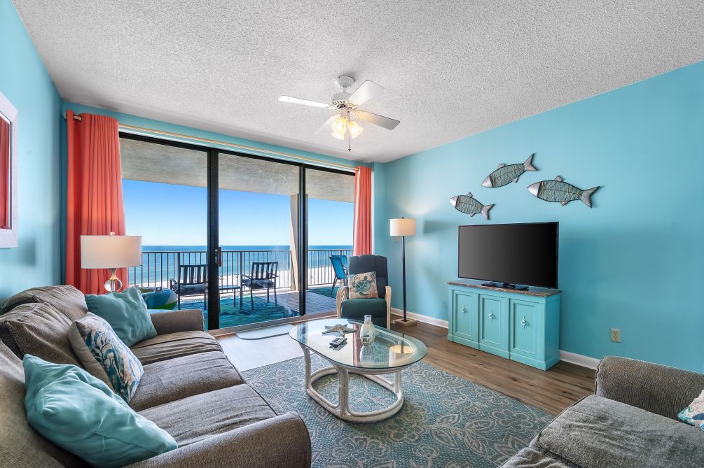 Welcome to this beautiful 3-bedroom condo in Orange Beach, perfect for up to 10 guests. The spacious living room is perfect for gathering with family and friends, featuring a smart TV for your entertainment.