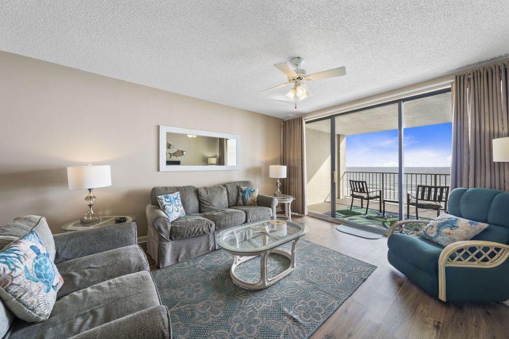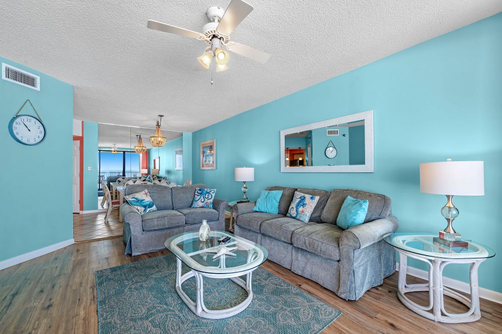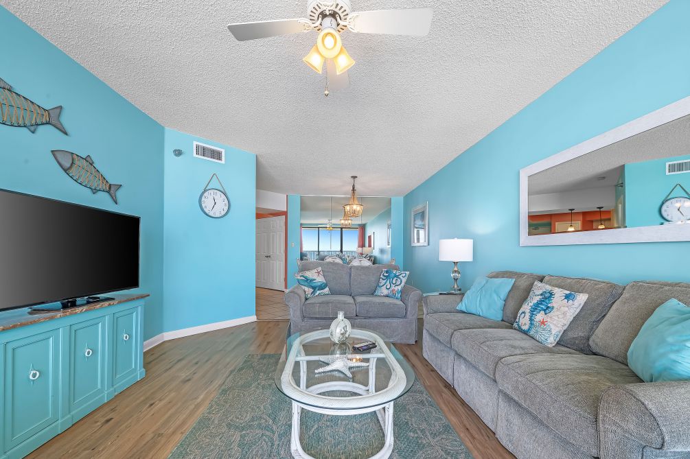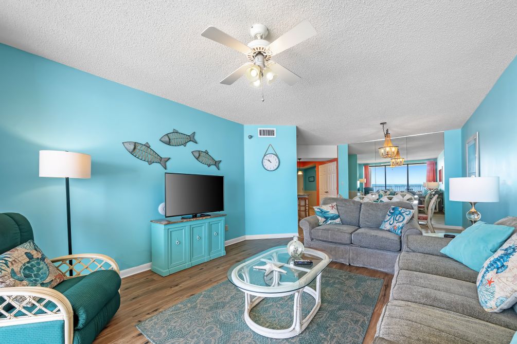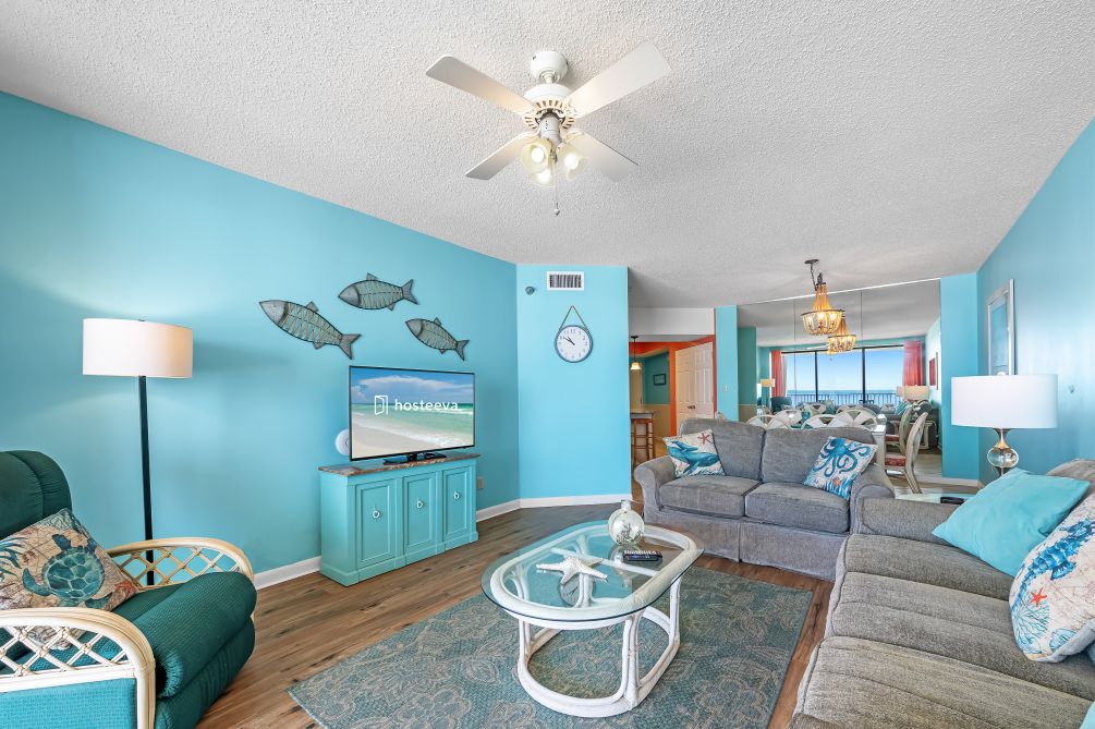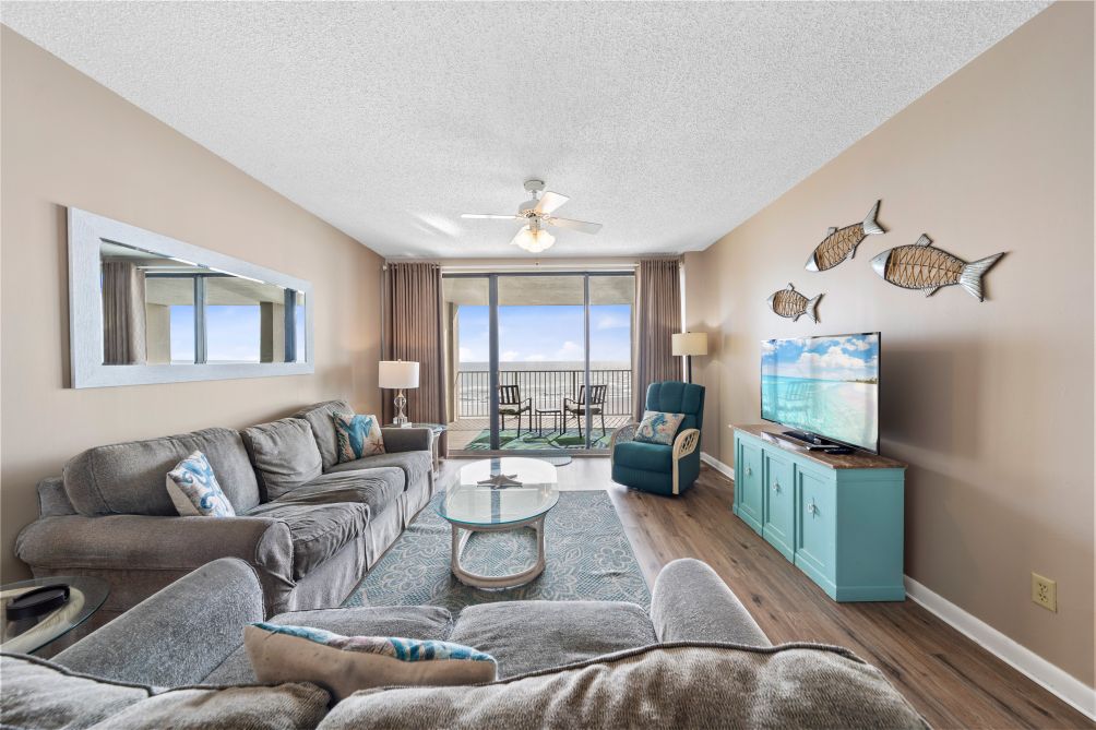 Welcome to this beautiful 3-bedroom condo in Orange Beach, perfect for up to 10 guests. The spacious living room is perfect for gathering with family and friends, featuring a smart TV for your entertainment.