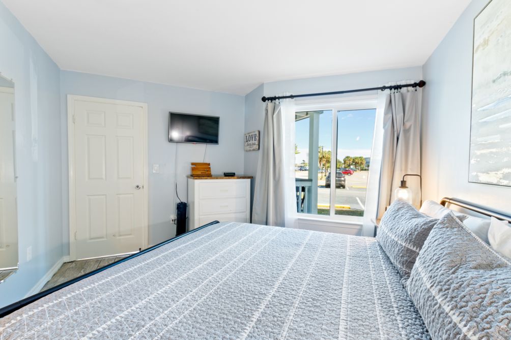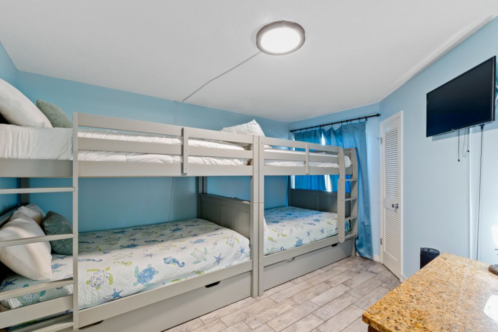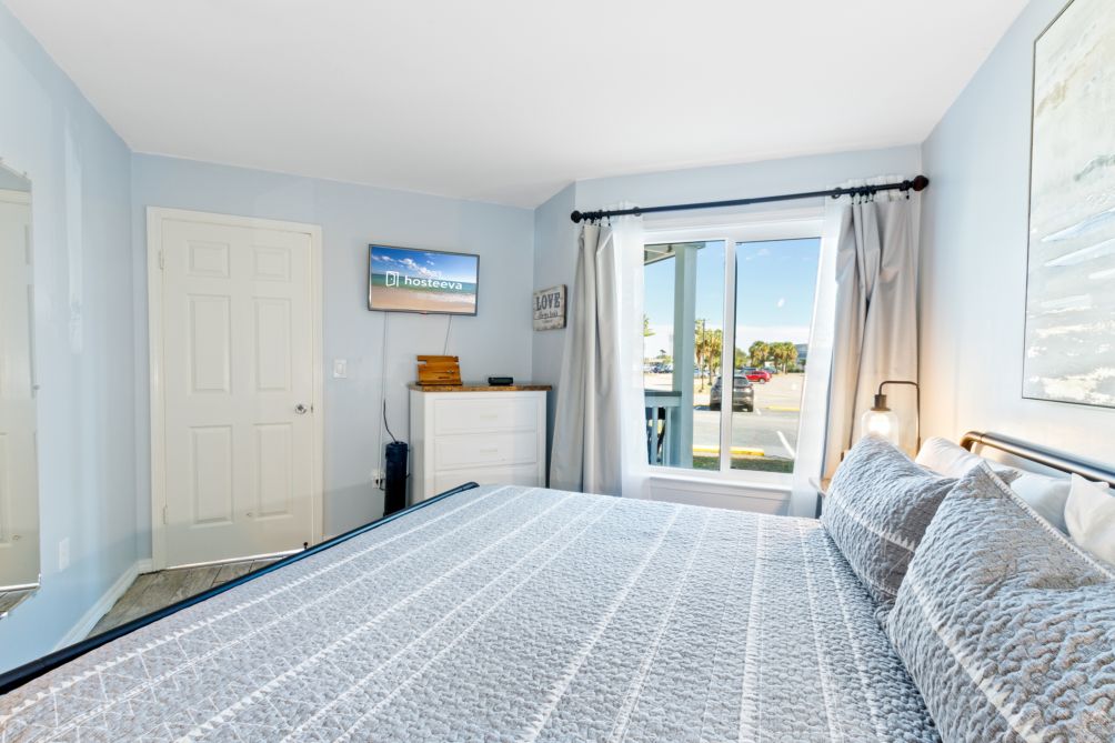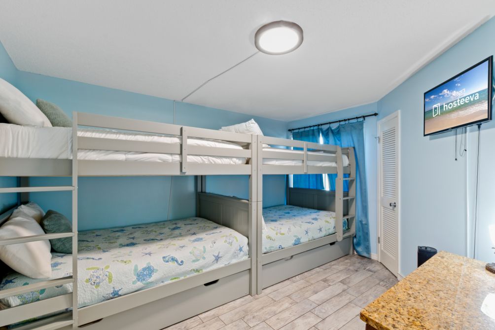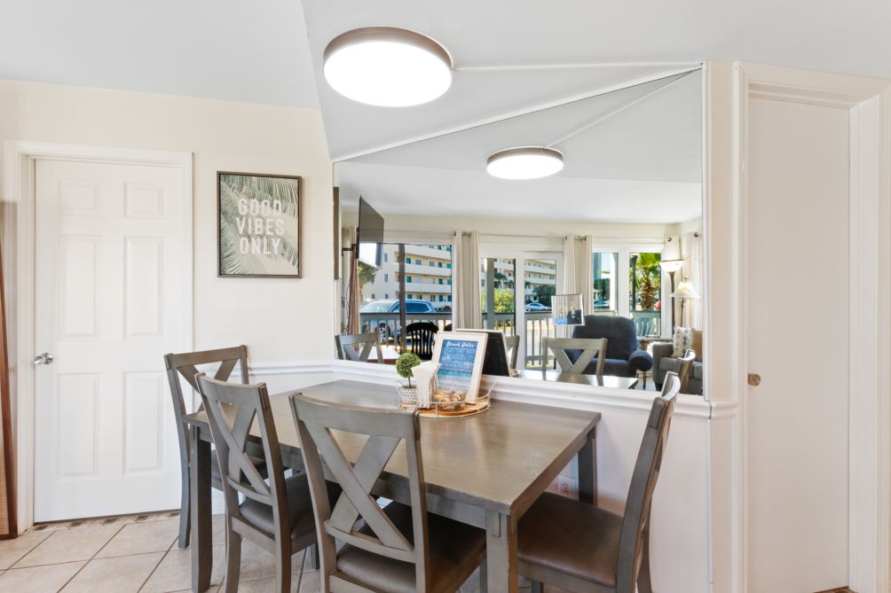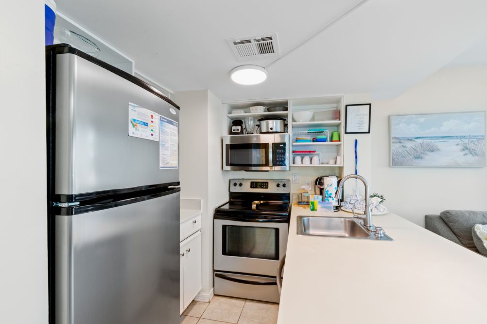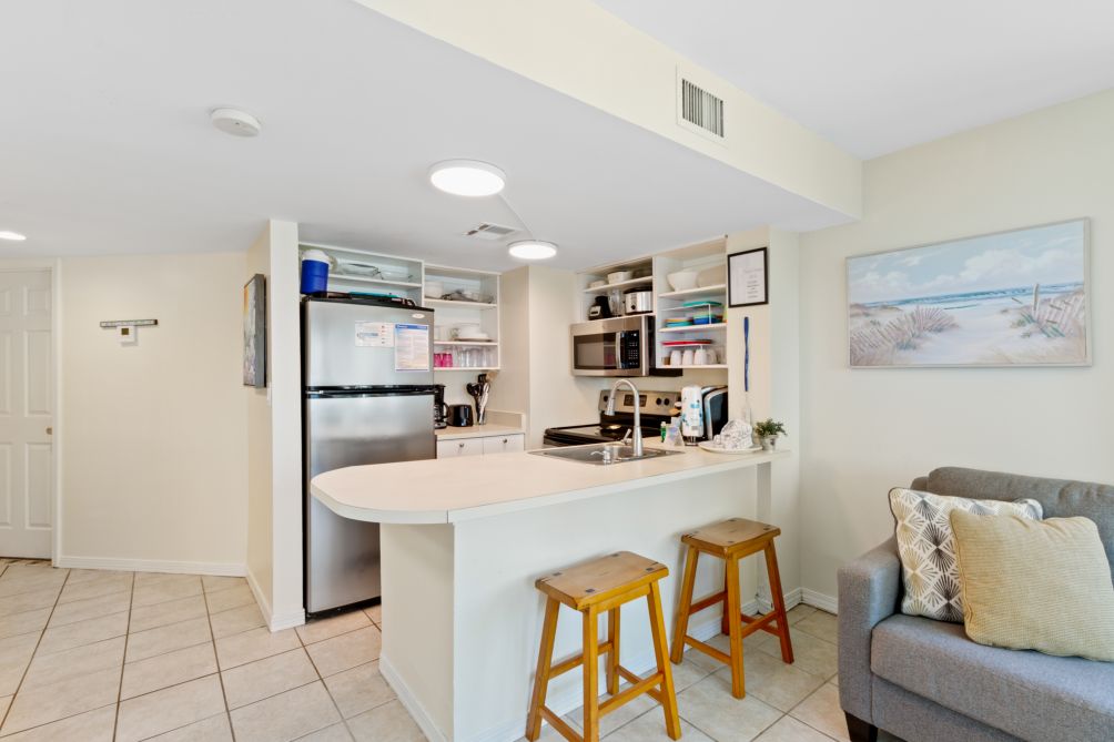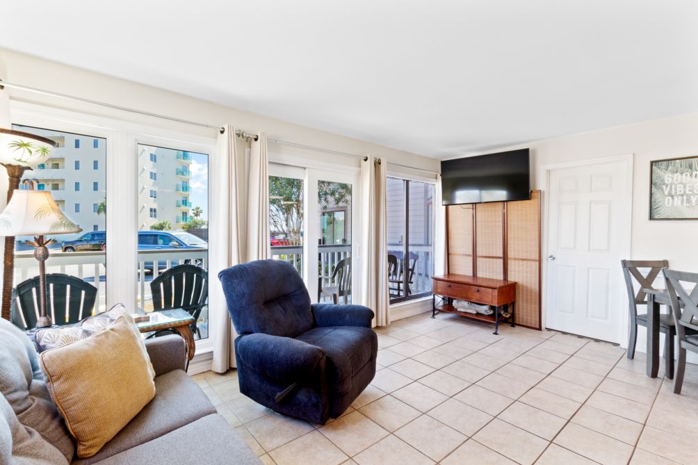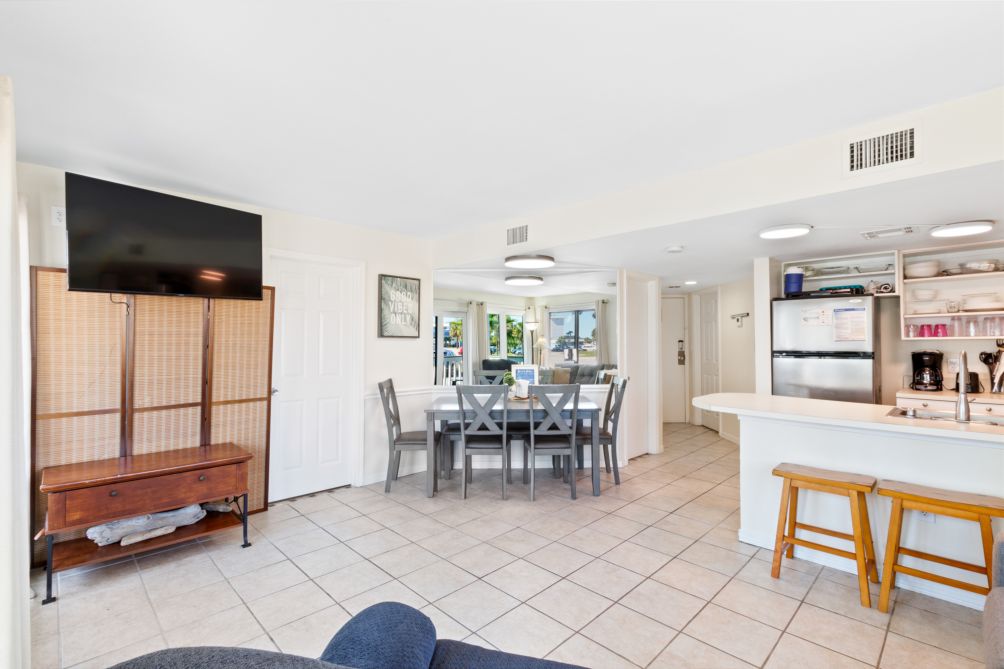 Step inside to find a spacious, open-concept living area adorned with plush seating and a large flat-screen TV, perfect for unwinding after a sun-soaked day at the beach. The modern, fully equipped kitchen seamlessly flows into the dining area, providing everything you need to enjoy home-cooked meals or quick snacks.
