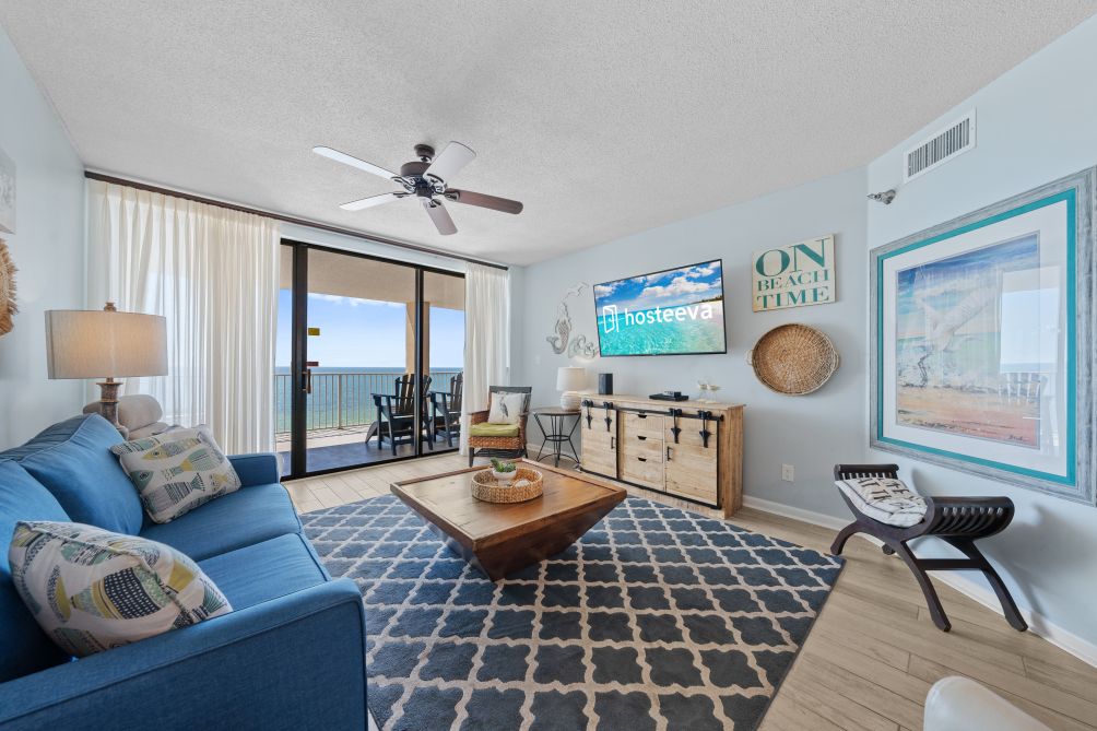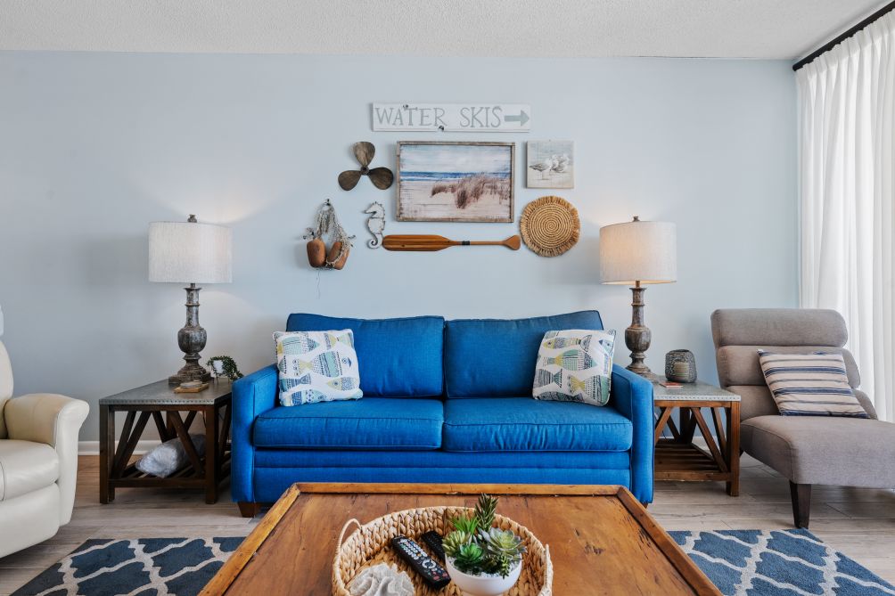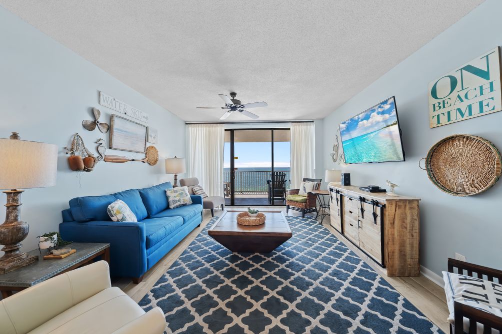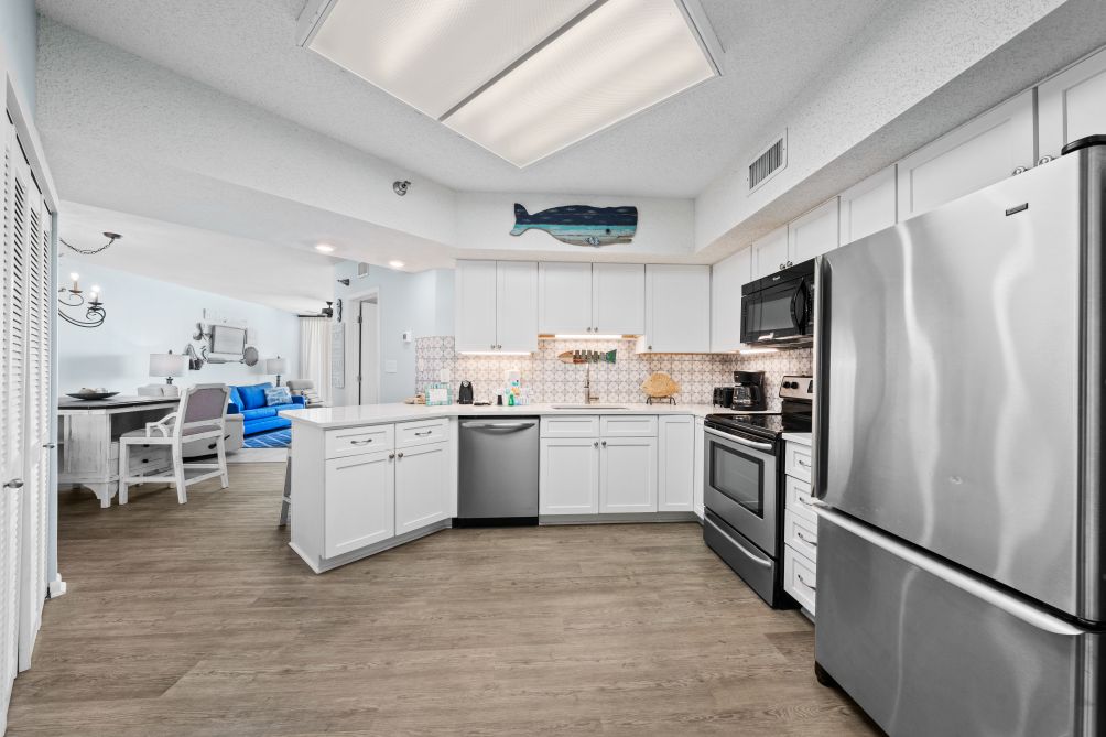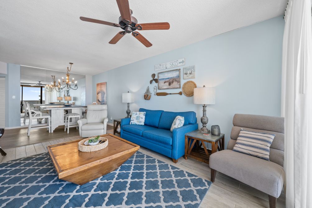 This inviting 3-bedroom, family-friendly condo in Orange Beach provides a wonderful retreat for a relaxing vacation. The spacious living room is designed for comfort, featuring cozy seating, a large TV, and plenty of natural light. Adjacent is a fully equipped kitchen with modern appliances, offering everything you need to prepare home-cooked meals, whether it's breakfast with the family or a quick snack after a day at the beach.