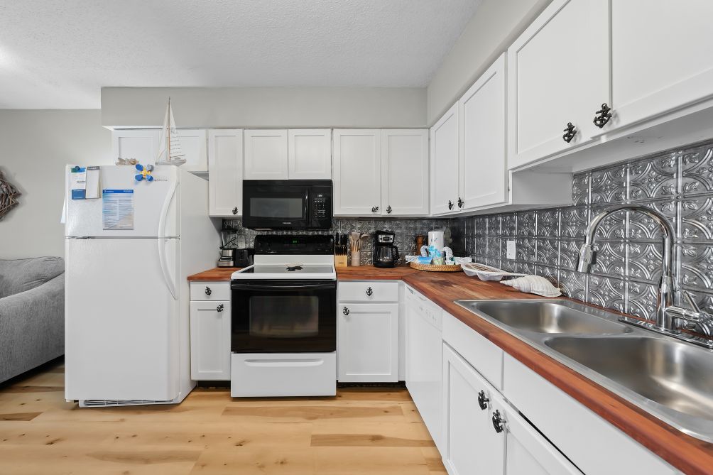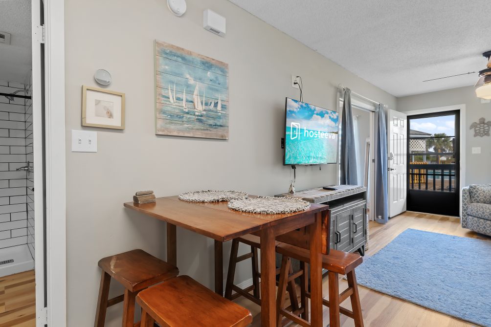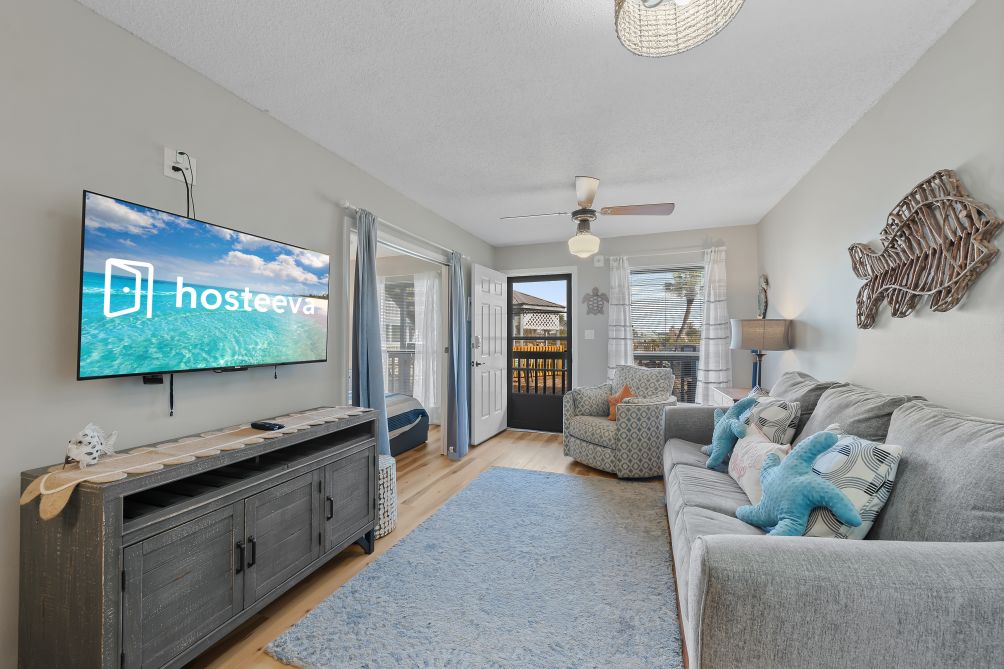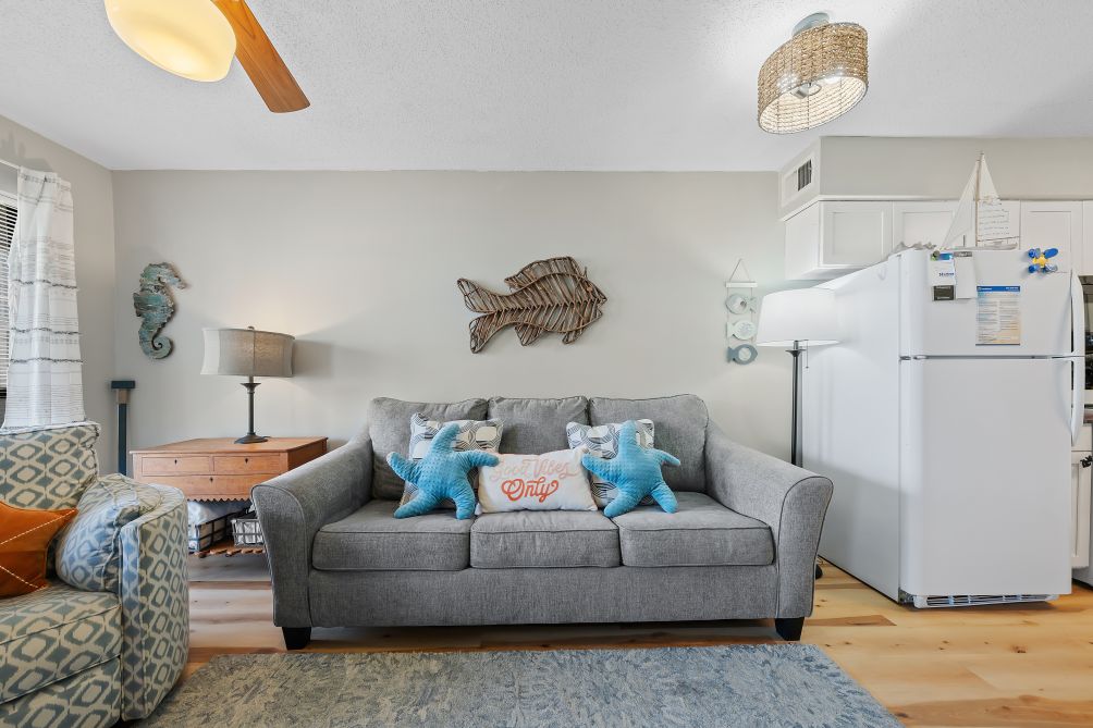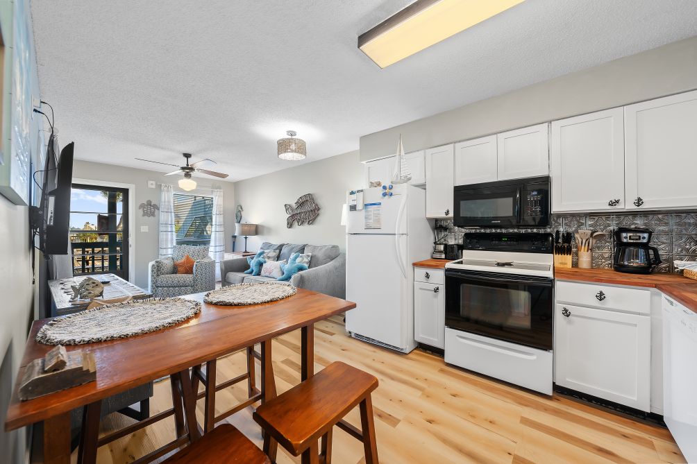Step inside and discover a spacious, open-concept living area featuring cozy seating and a large flat-screen TV, perfect for relaxing after a sun-filled day at the beach. The modern, fully equipped kitchen flows seamlessly into the dining area, offering everything you need to prepare home-cooked meals or quick bites.
