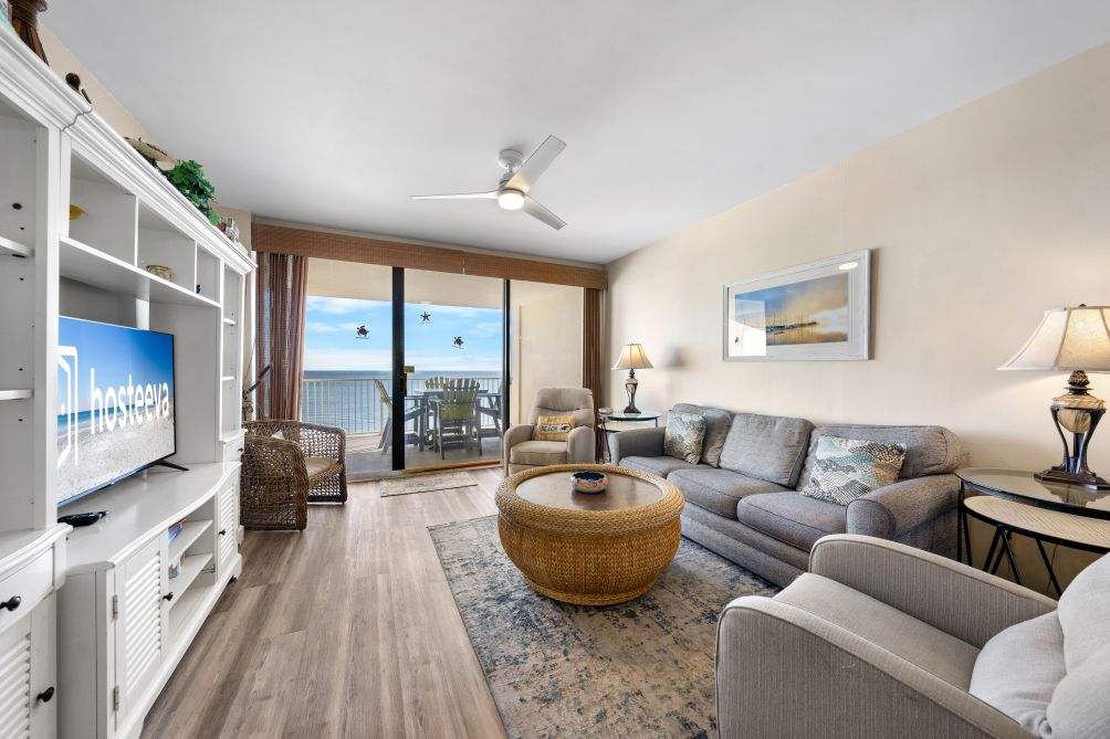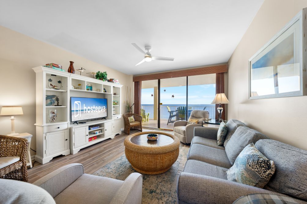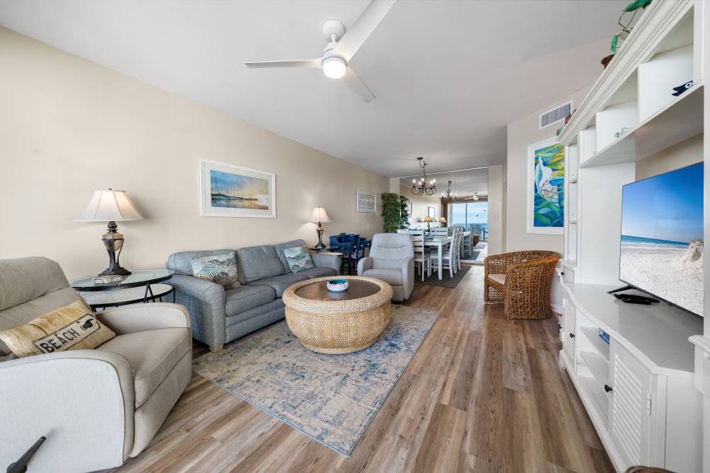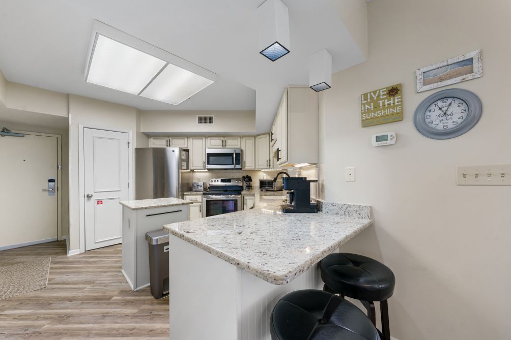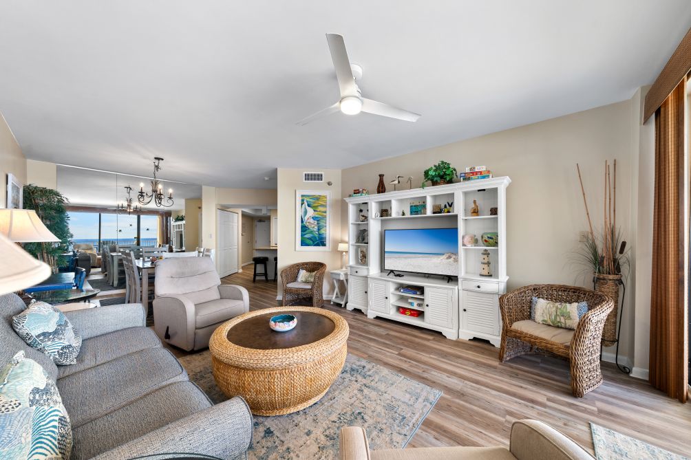 This charming 3-bedroom condo in Orange Beach is perfect for a relaxing family getaway. The living room is spacious and inviting, with plenty of comfortable seating, a large TV, and an abundance of natural light streaming in. The kitchen is fully stocked with modern appliances, making it easy to prepare anything from a full family breakfast to light snacks after a day spent at the beach.