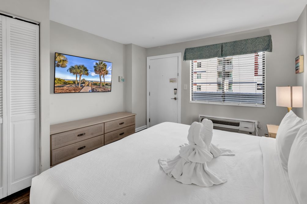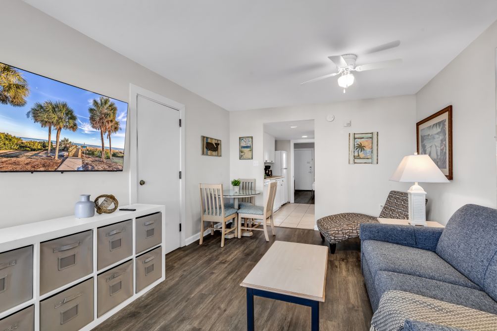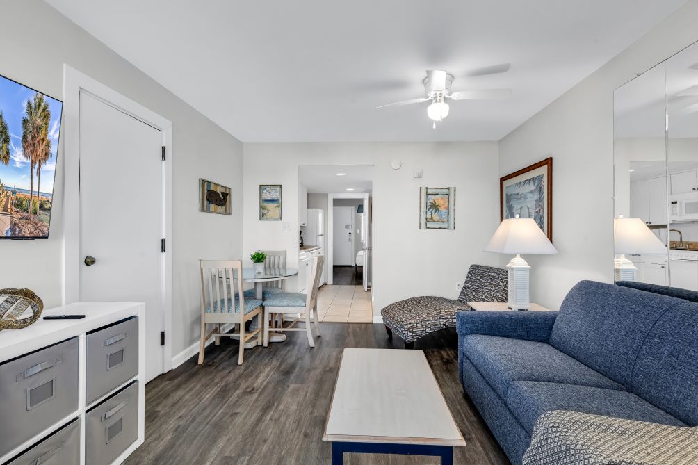 This charming 1-bedroom condo in Myrtle Beach is an ideal beachside retreat, providing all the comforts of home. The roomy living area is perfect for unwinding, while the cozy dining space and fully-equipped kitchen make it easy to prepare and savor your own meals.
