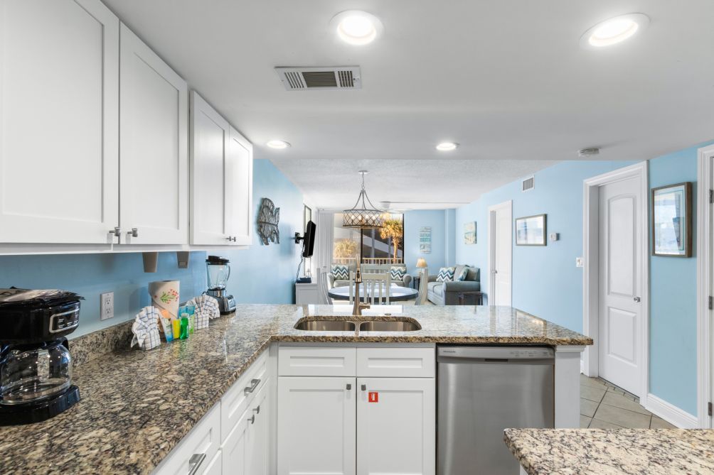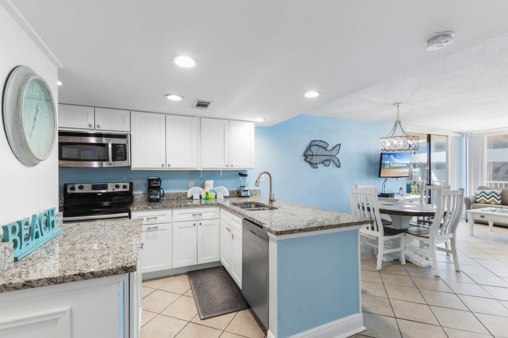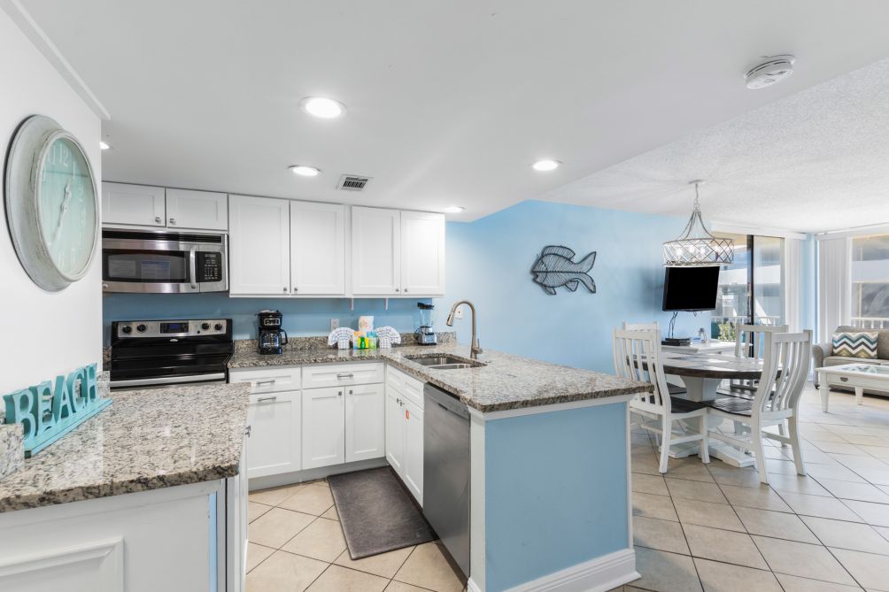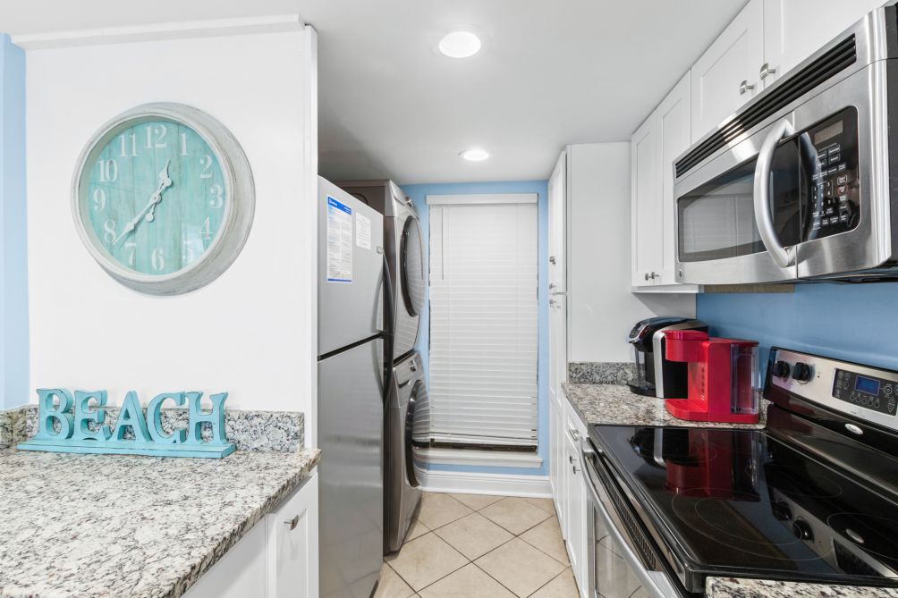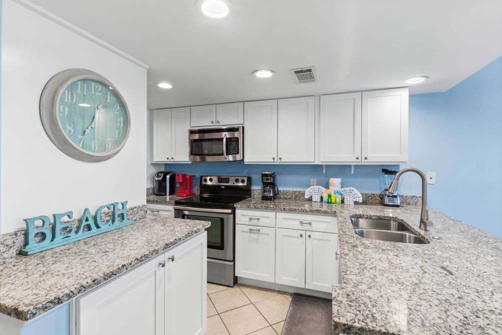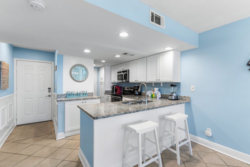 Inside, the condo features an open-concept living and dining area with plenty of natural light. The fully equipped kitchen includes modern appliances and a breakfast bar, providing everything needed for home-cooked meals.