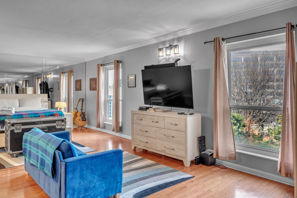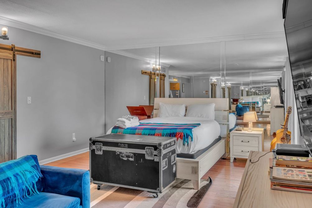 Whether you’re in town for a romantic escape, a solo journey, or a fun group getaway, this studio is your backstage pass to Nashville. Unwind in the guitar-shaped pool or let the history of Music Row inspire you. The Honky Tonk Angels Suite offers a one-of-a-kind stay in the heart of Music City.