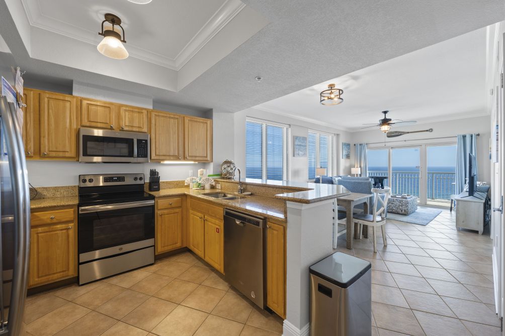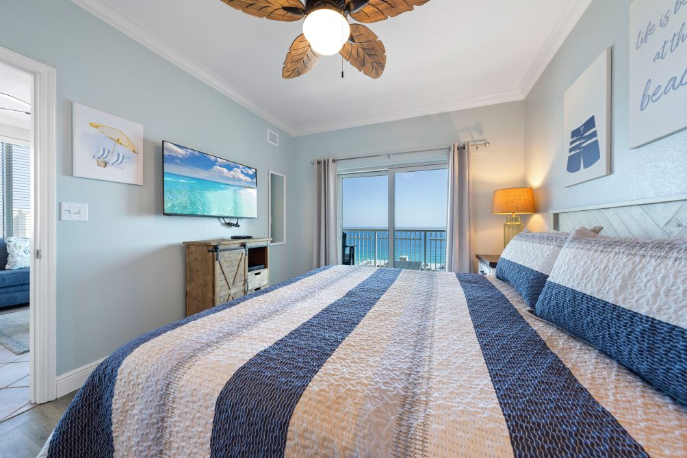 Inside, the condo is designed for comfort, featuring a fully stocked kitchen, a full-size washer and dryer, and TVs in both bedrooms and the living room. An elevator provides easy access to both the beach walkway and your unit.