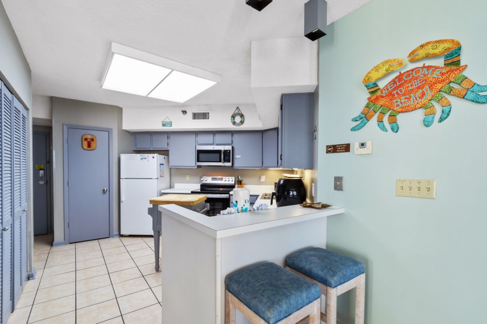 The bright and airy living room is perfect for gathering, and has amazing views of the water right from your comfy living room. The fully equipped kitchen has everything you need to prepare home-cooked meals, while the adjacent dining area provides a cozy space to enjoy them together. Step onto the private balcony and take in breathtaking beach views—your perfect spot for morning coffee or sunset relaxation.