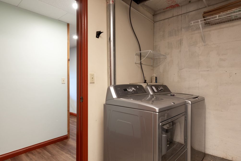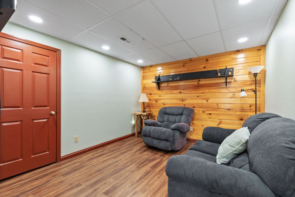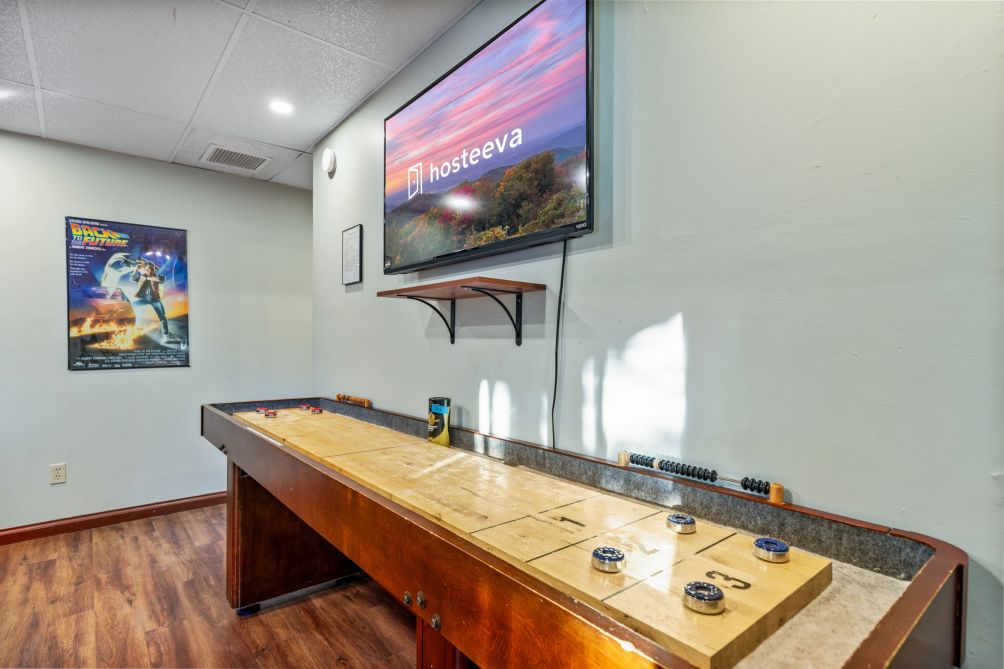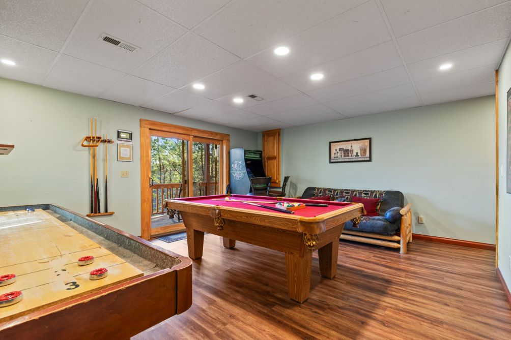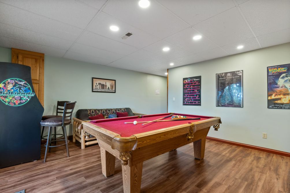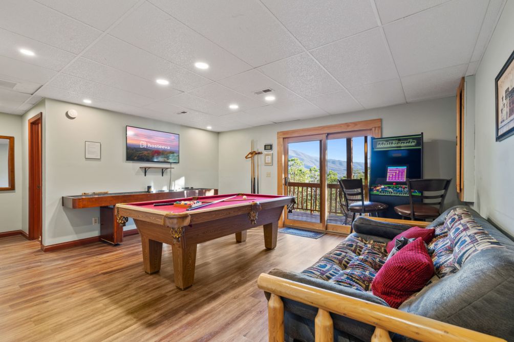The main level features a primary suite, while downstairs hosts a second bedroom and a large game room equipped with a pool table, shuffleboard, and arcade games.